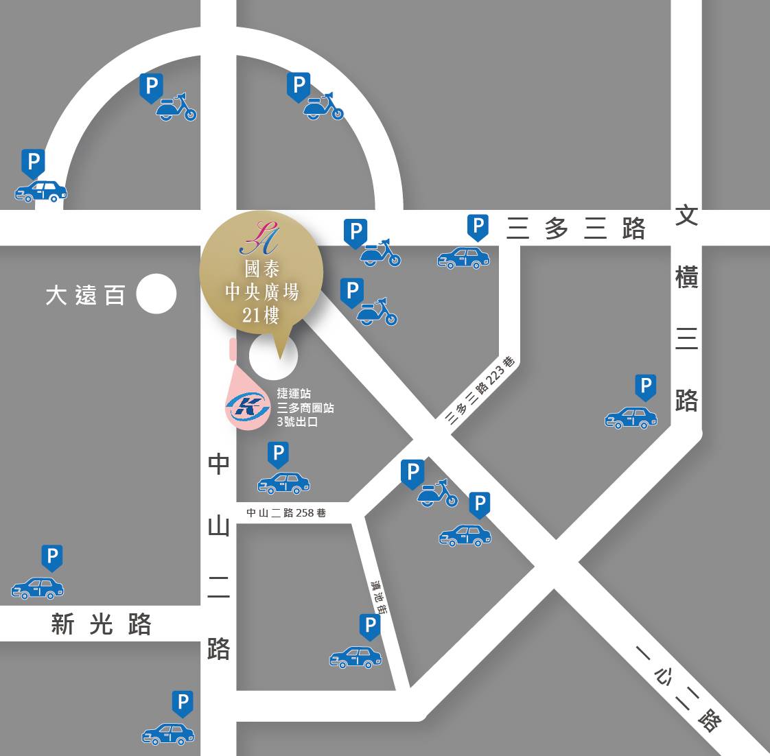 高雄捷運紅線三多商圈(R8)站3號出口之左側國泰中央廣場大門進入,搭電梯至21樓即可到萊波亞美醫診所。