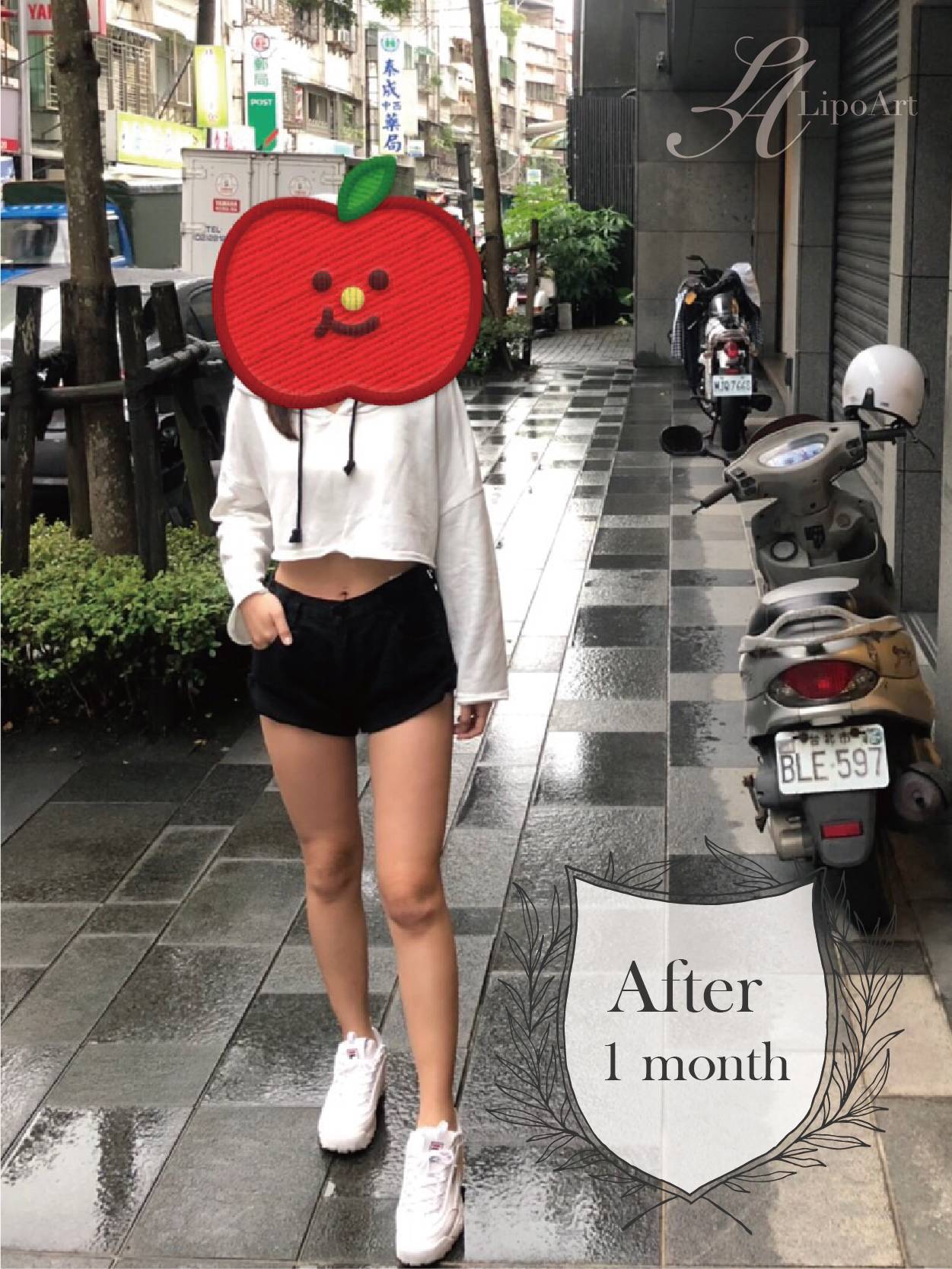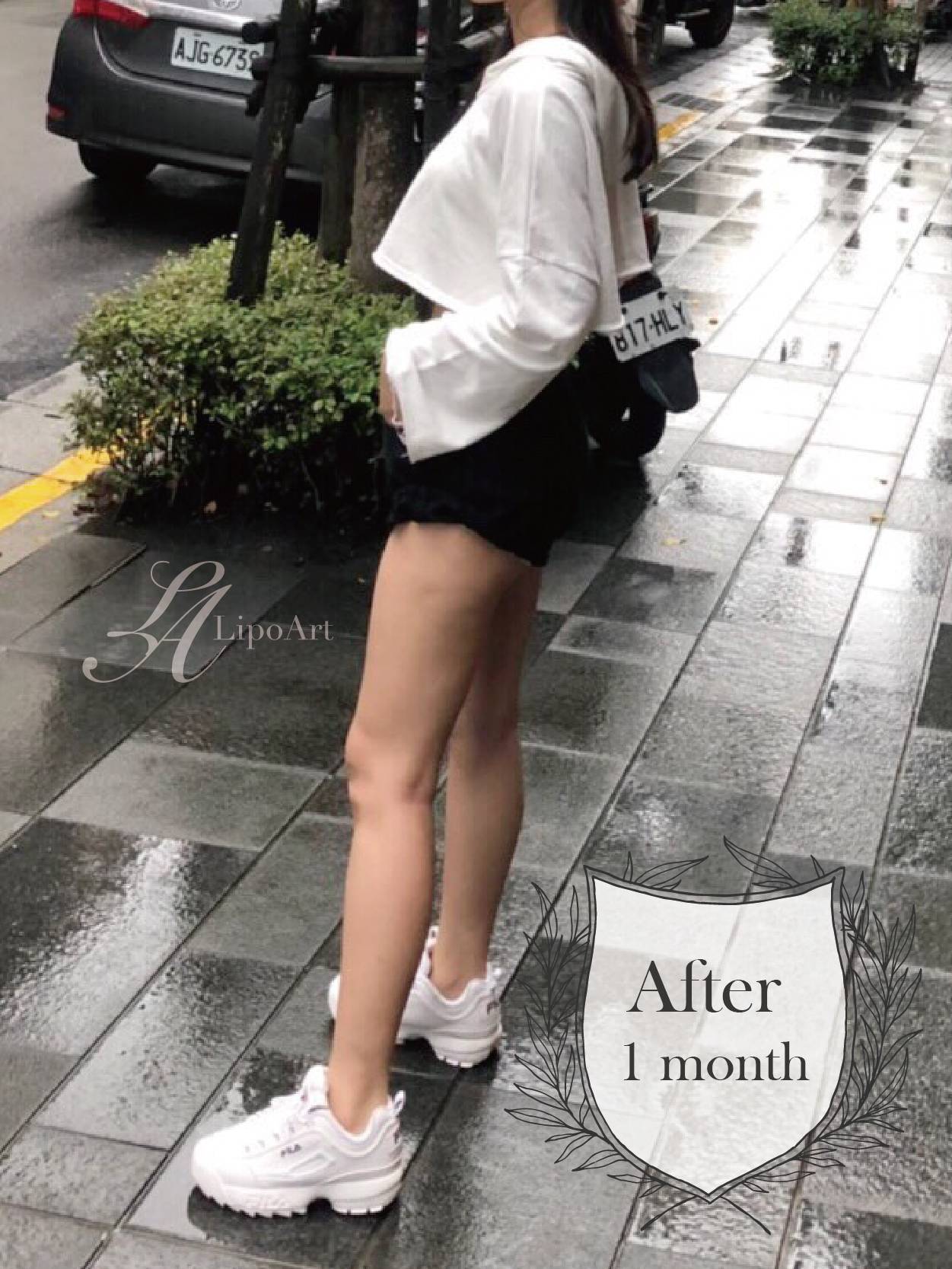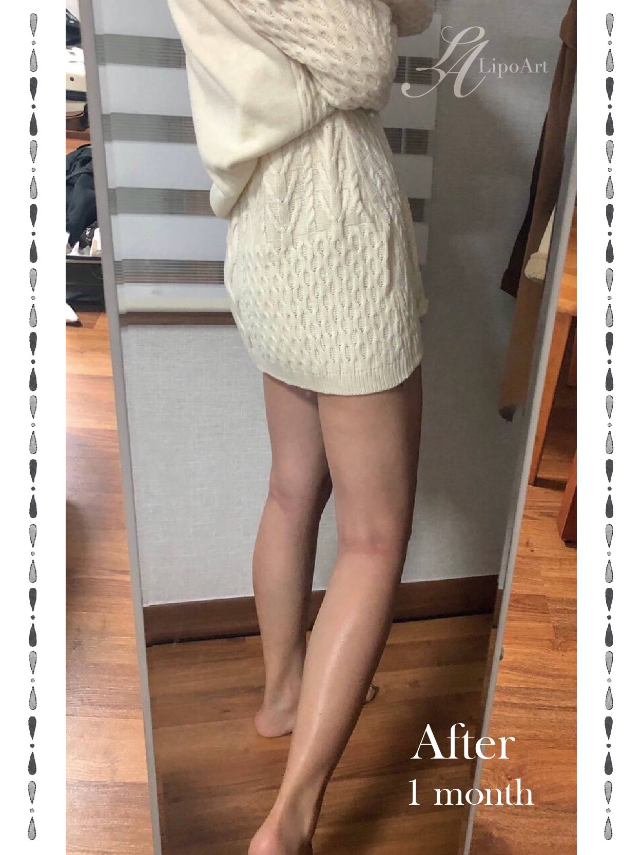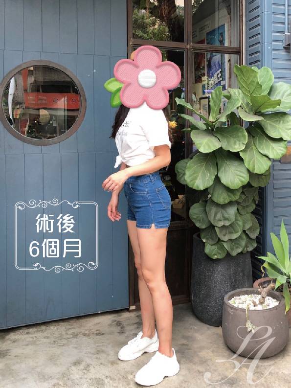 ▲術後正面紀錄(右) : 術後皮下脂肪層均勻變薄,使整體線條平滑柔順,比例更為挑高、修長。