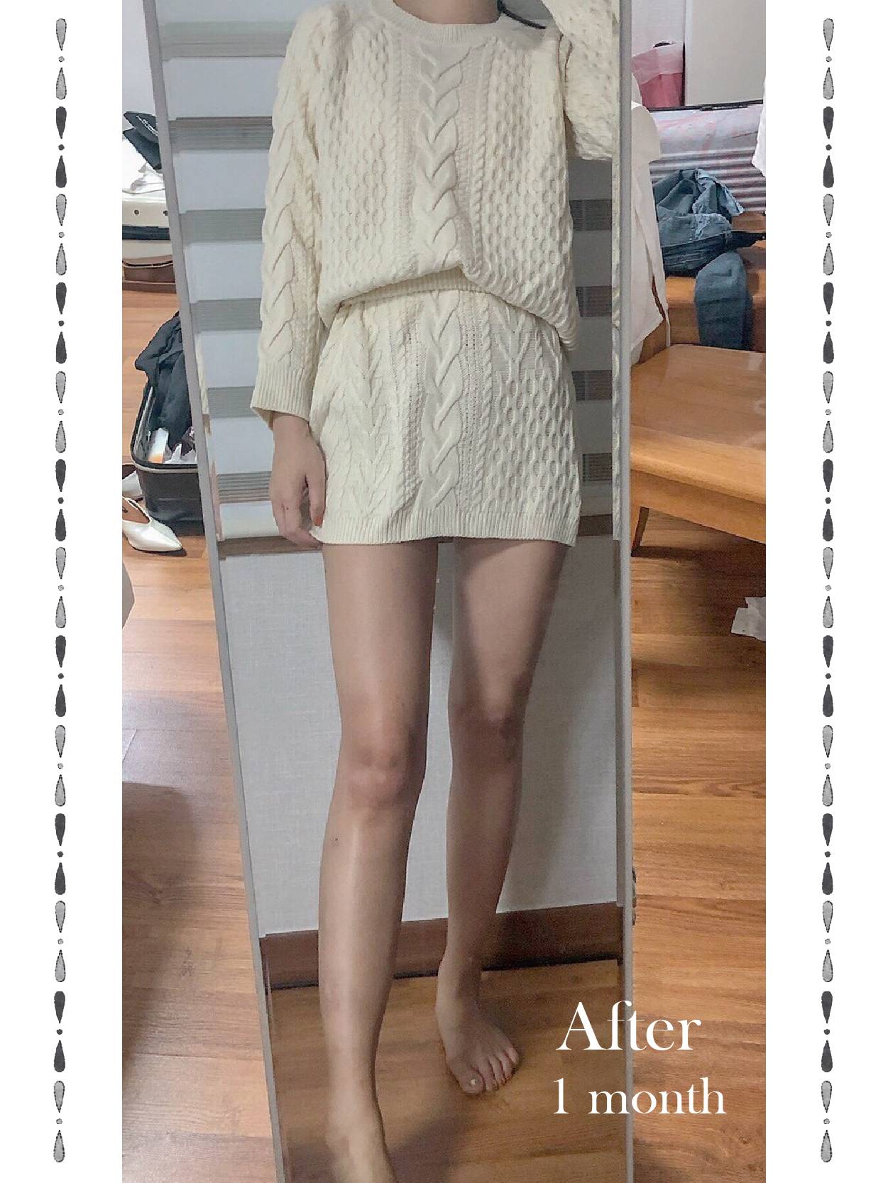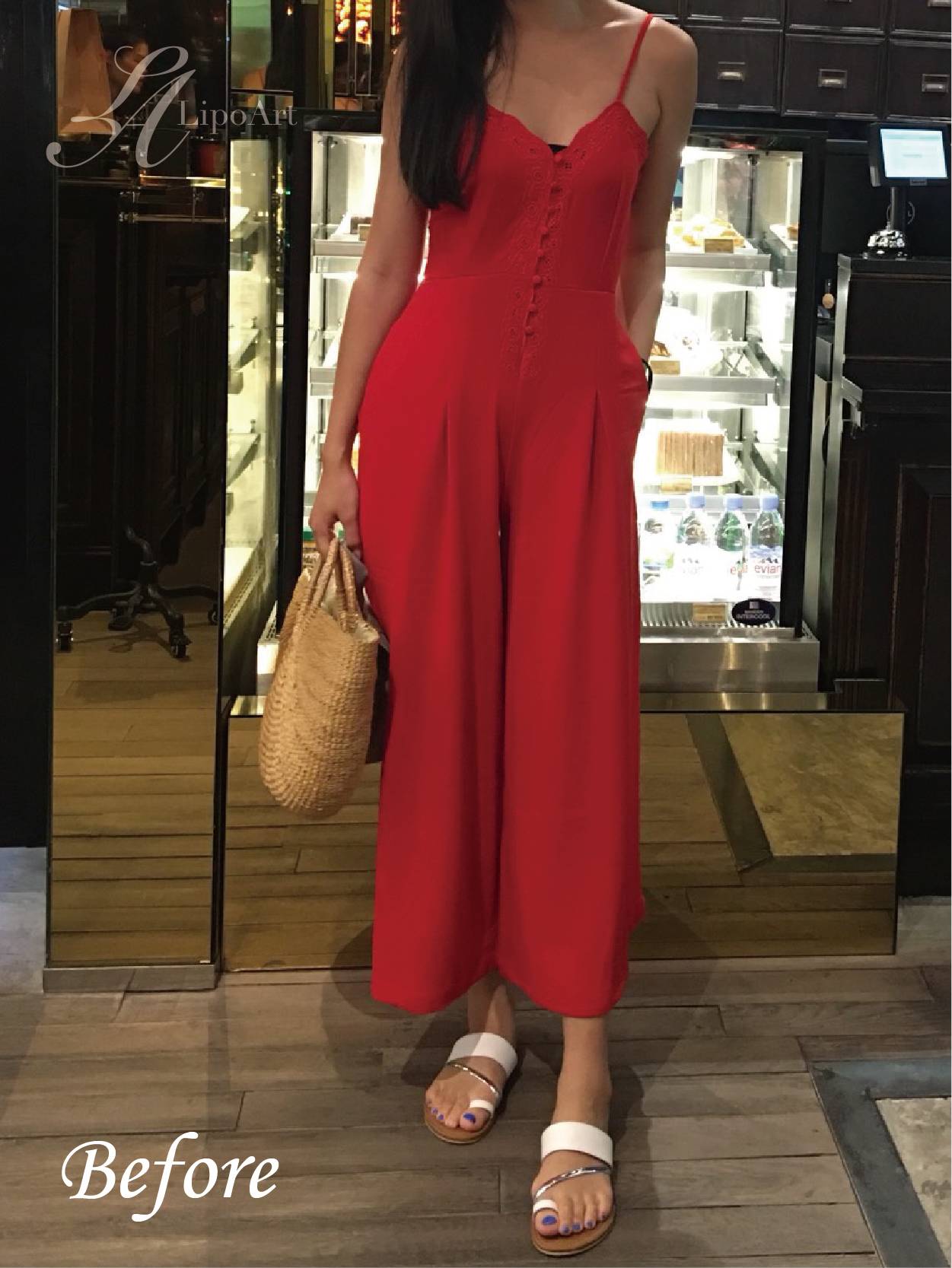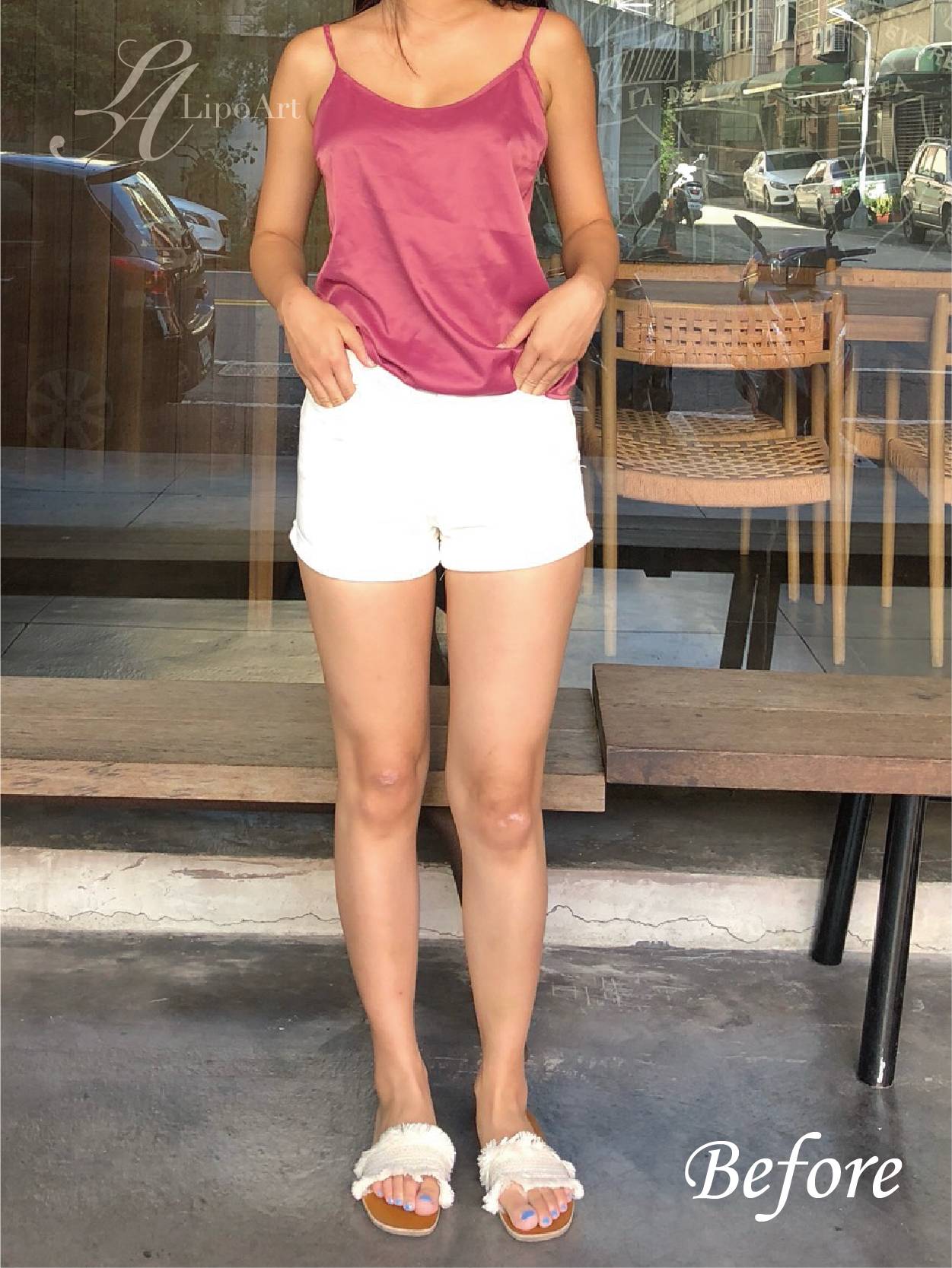▲術前正面紀錄(左) : 術前大腿脂肪局部肥大,連帶影響臀部線條,使夏天穿短褲、迷你裙,視覺比例感不佳。