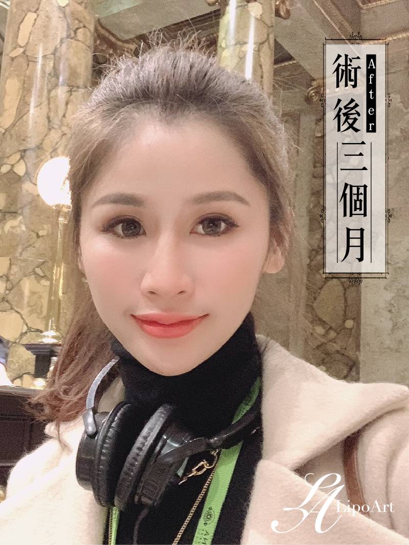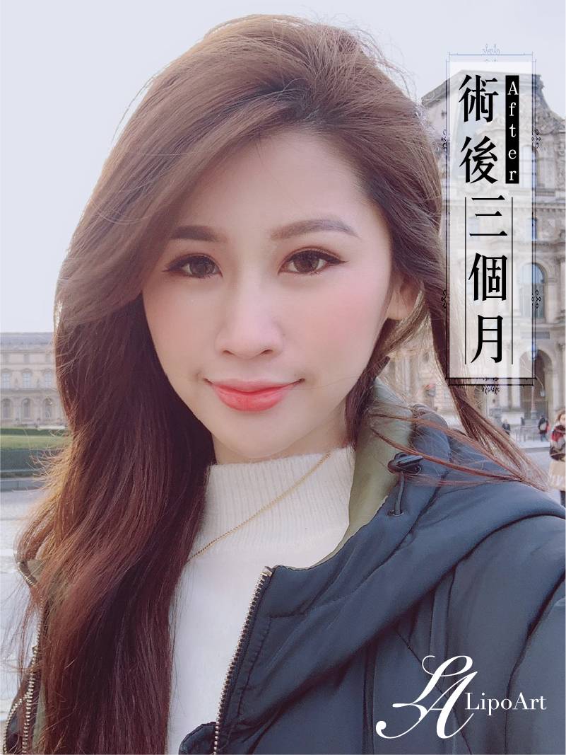 ▲ 術後整體紀錄(右):術後將自體脂肪膠移植,脂肪存活在凹溝中,除有填充效果外,整體臉型也變得更為柔順、立體。