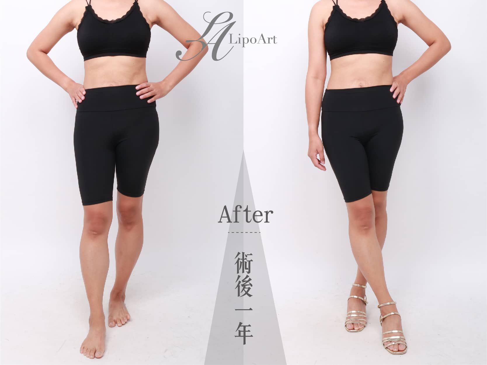 ▲術後整體紀錄(右):透過第四代電波拉提,使腹部肌膚獲得拉提,產後造成的下垂與抽脂後的鬆弛部位得到顯著改善,整體線條也更為緊實。