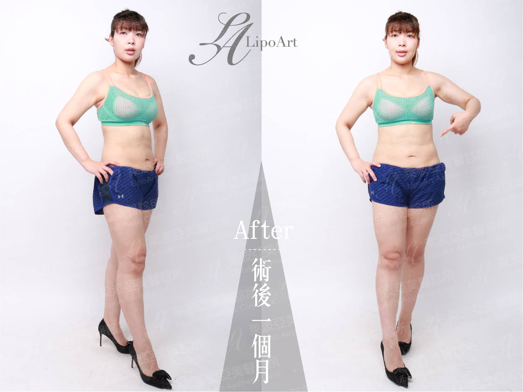 ▲術後正面紀錄(右):上腹明顯收緊,下腹變得平坦,由上方沿伸下來的人魚線條陰影加深,使整體視覺效果更加緊緻有形。