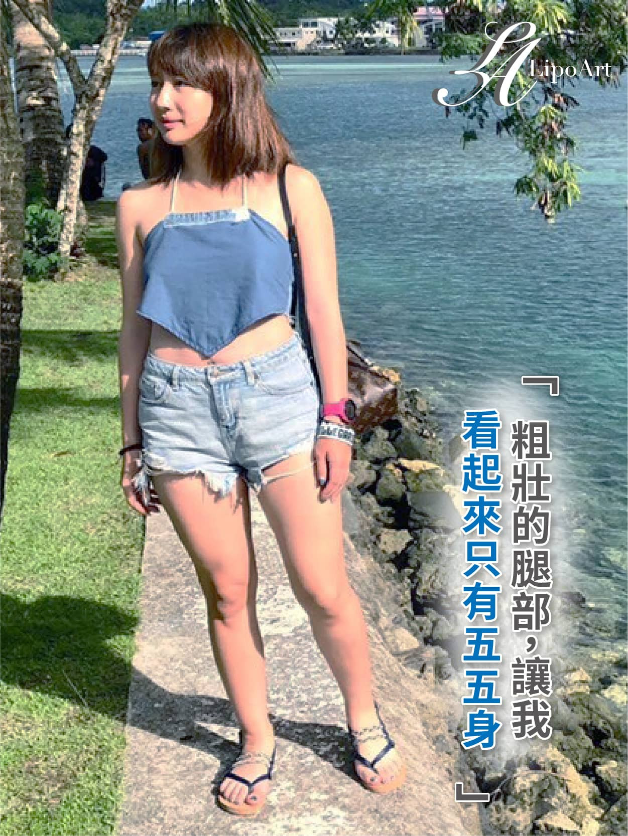 術後正面紀錄(右):後移除大腿多餘脂肪,下半身曲線穠纖合度,呈現常見於模特的H身形,視覺上整體尺寸明顯縮小一號。