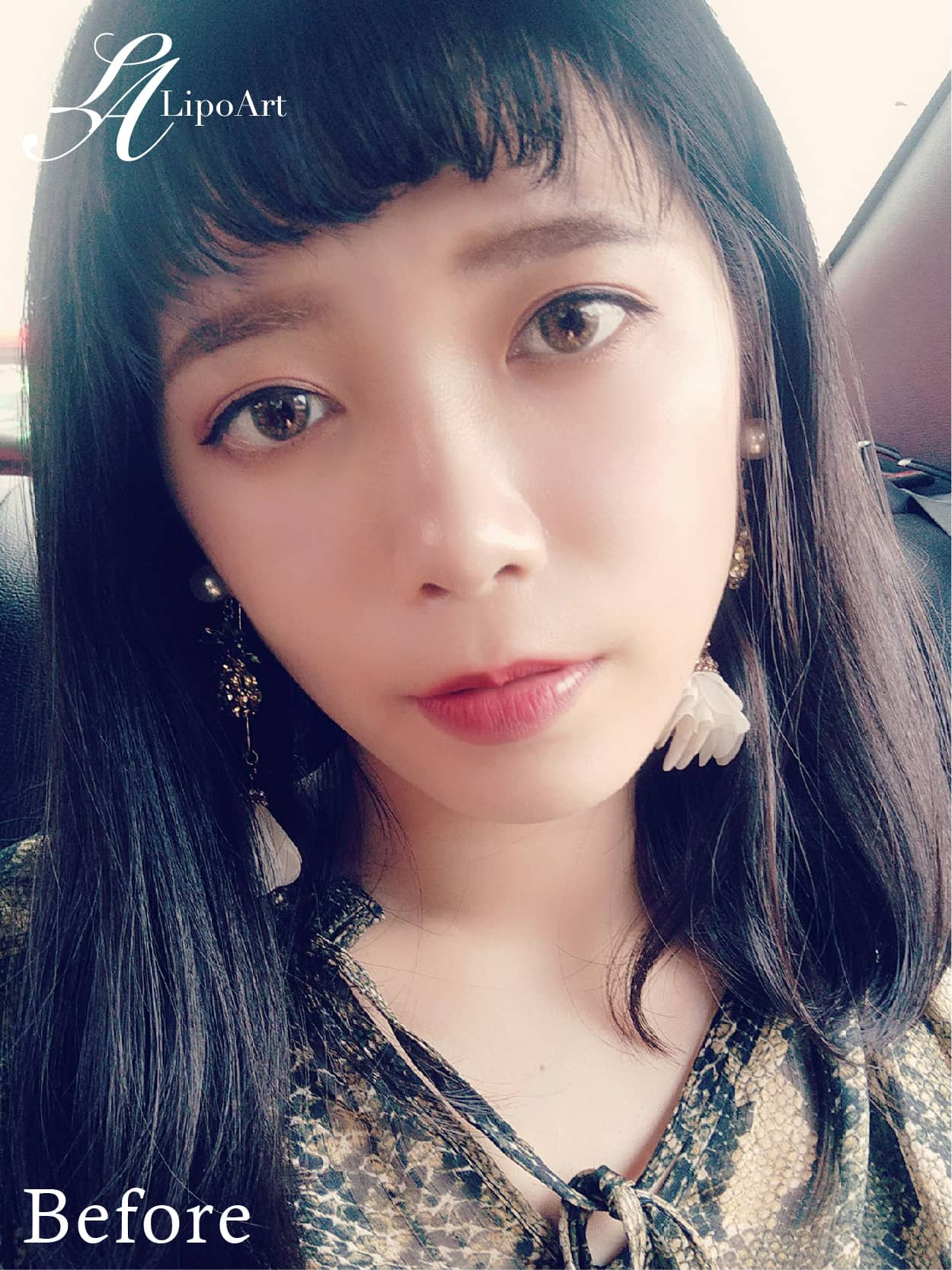 術前整體紀錄(左):下巴比例偏短小方正,使得臉部整體視覺效果外擴不夠集中,無法突顯五官精緻度。