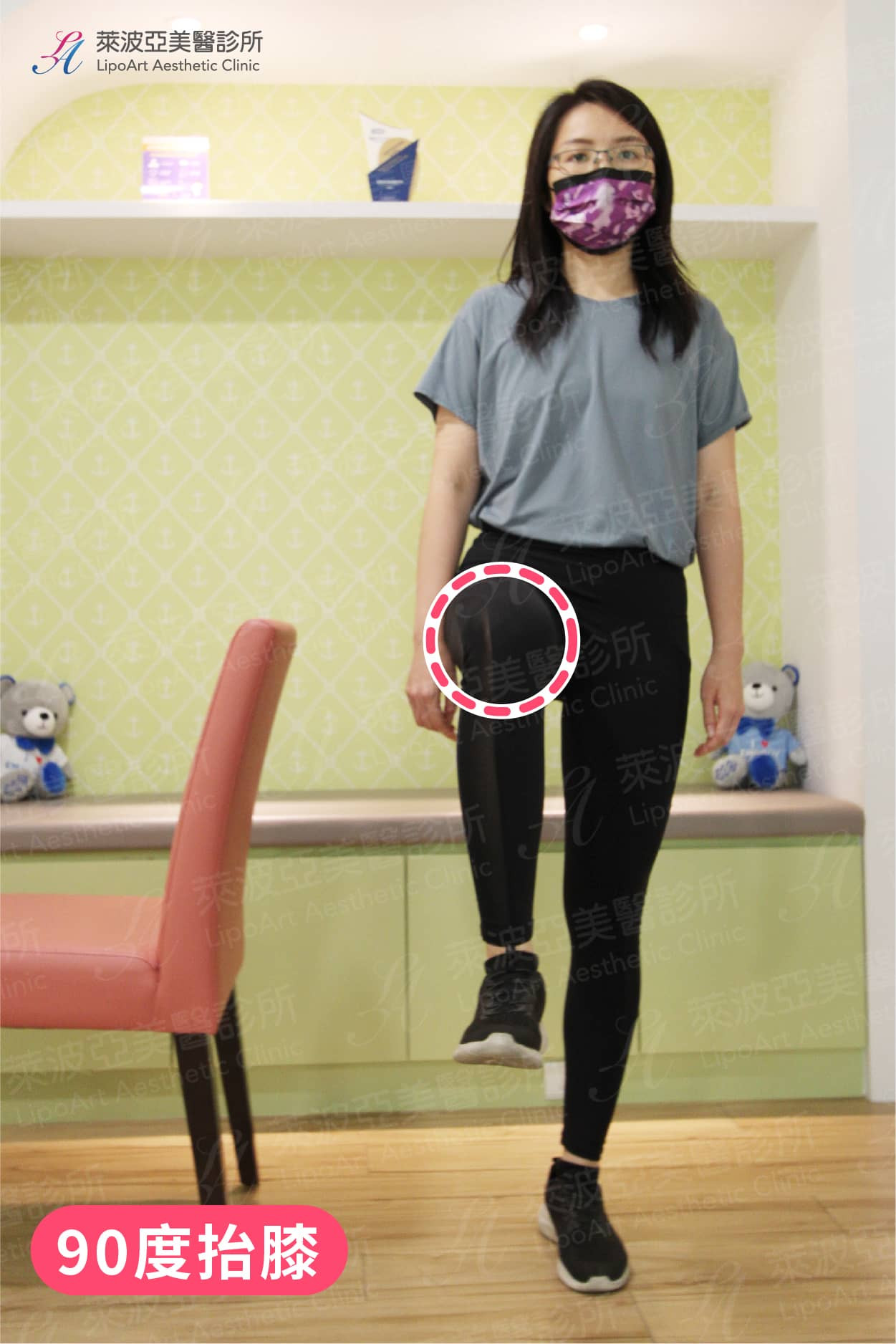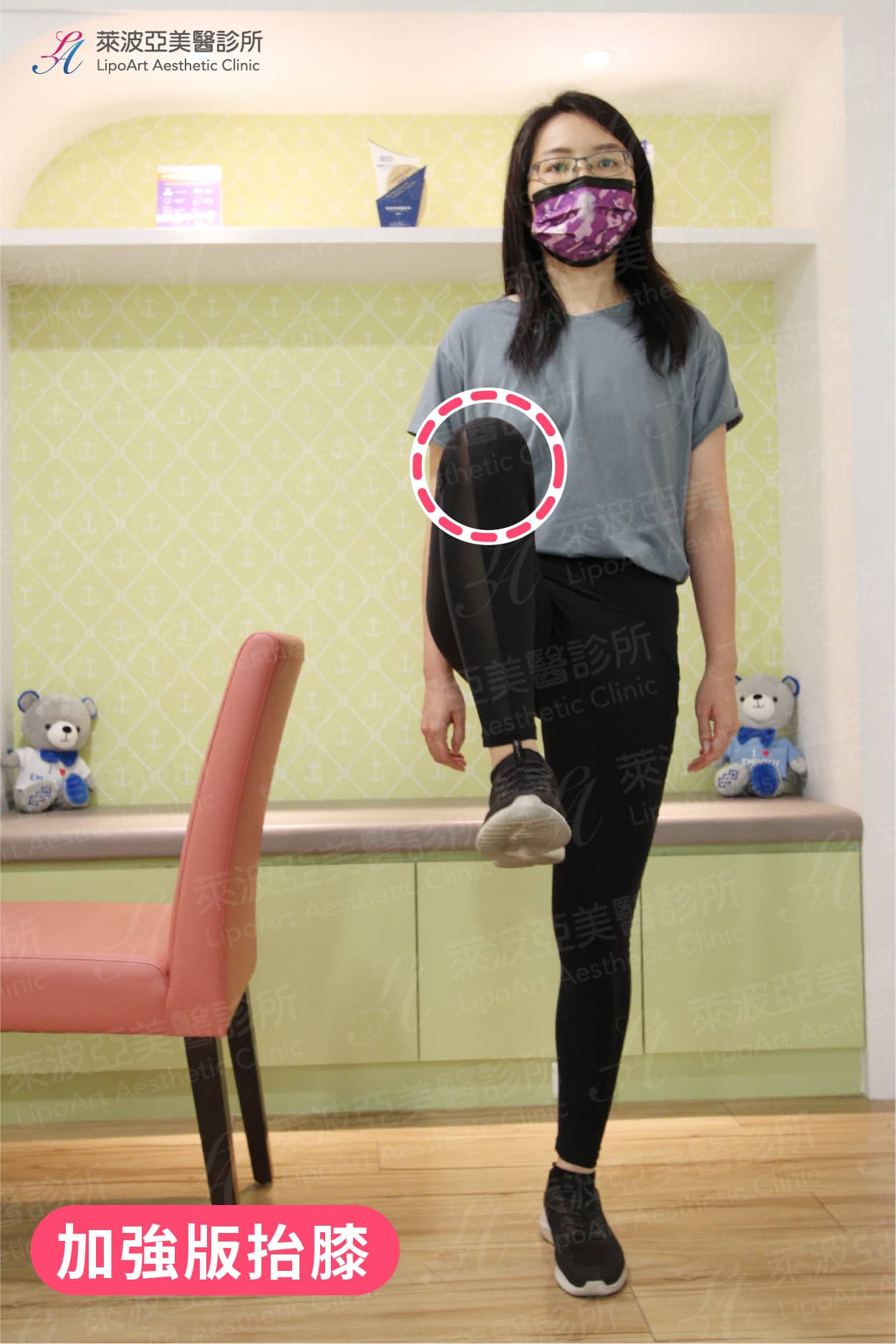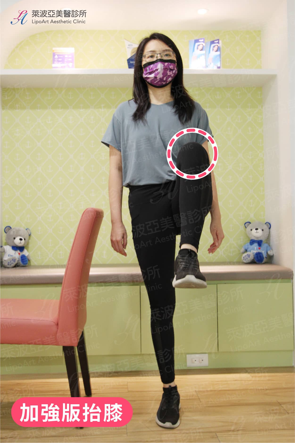 (2) 訓練包含大腿前側的股四頭肌和後側膕繩肌,強壯的肌肉可以增加膝關節的穩定度,並且在身體支撐體重的時候,減輕軟骨的負重。