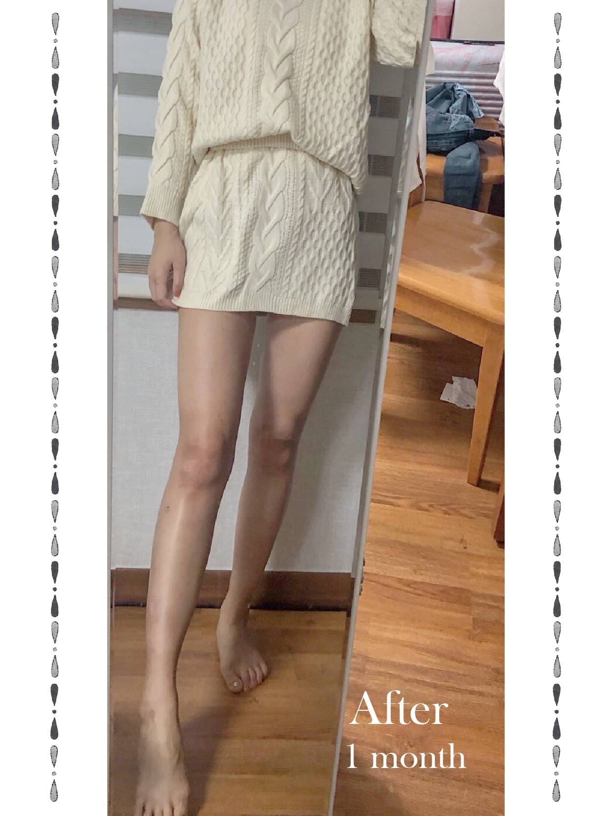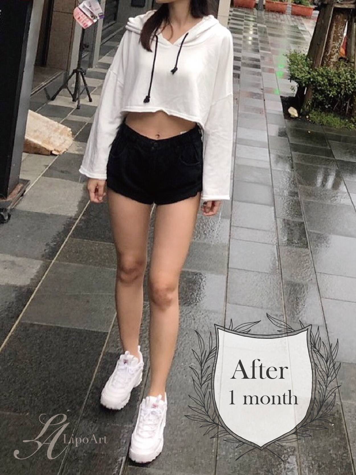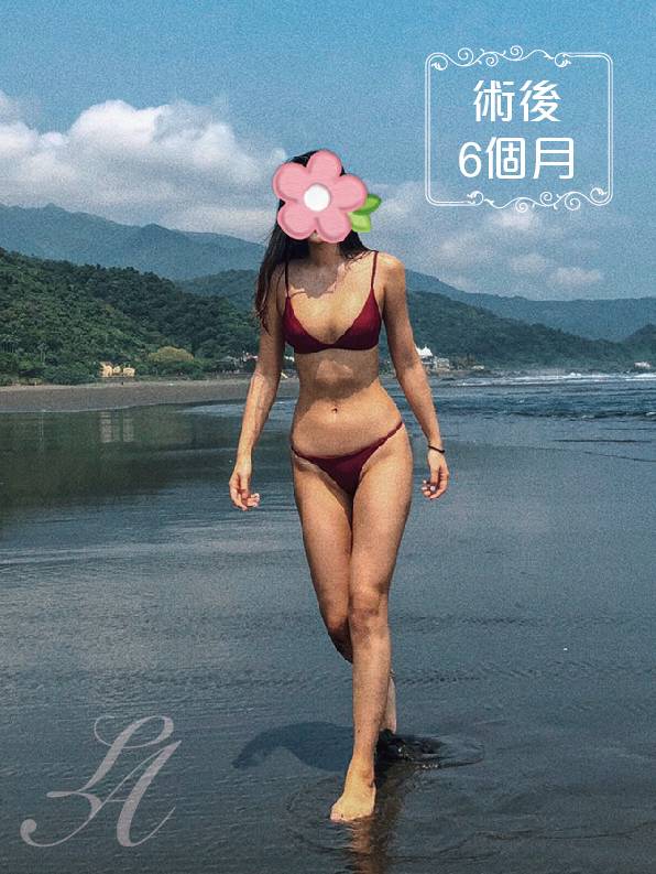 ▲術後正面紀錄(右) : 術後皮下脂肪層均勻變薄,使整體線條平滑柔順,比例更為挑高、修長。