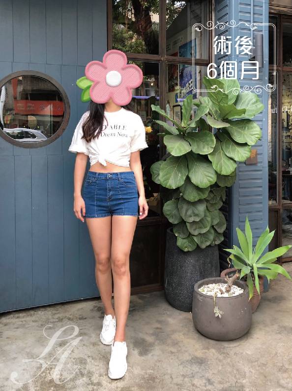 ▲術前正面紀錄(左) : 術前大腿脂肪局部肥大,連帶影響臀部線條,使夏天穿短褲、迷你裙,視覺比例感不佳。