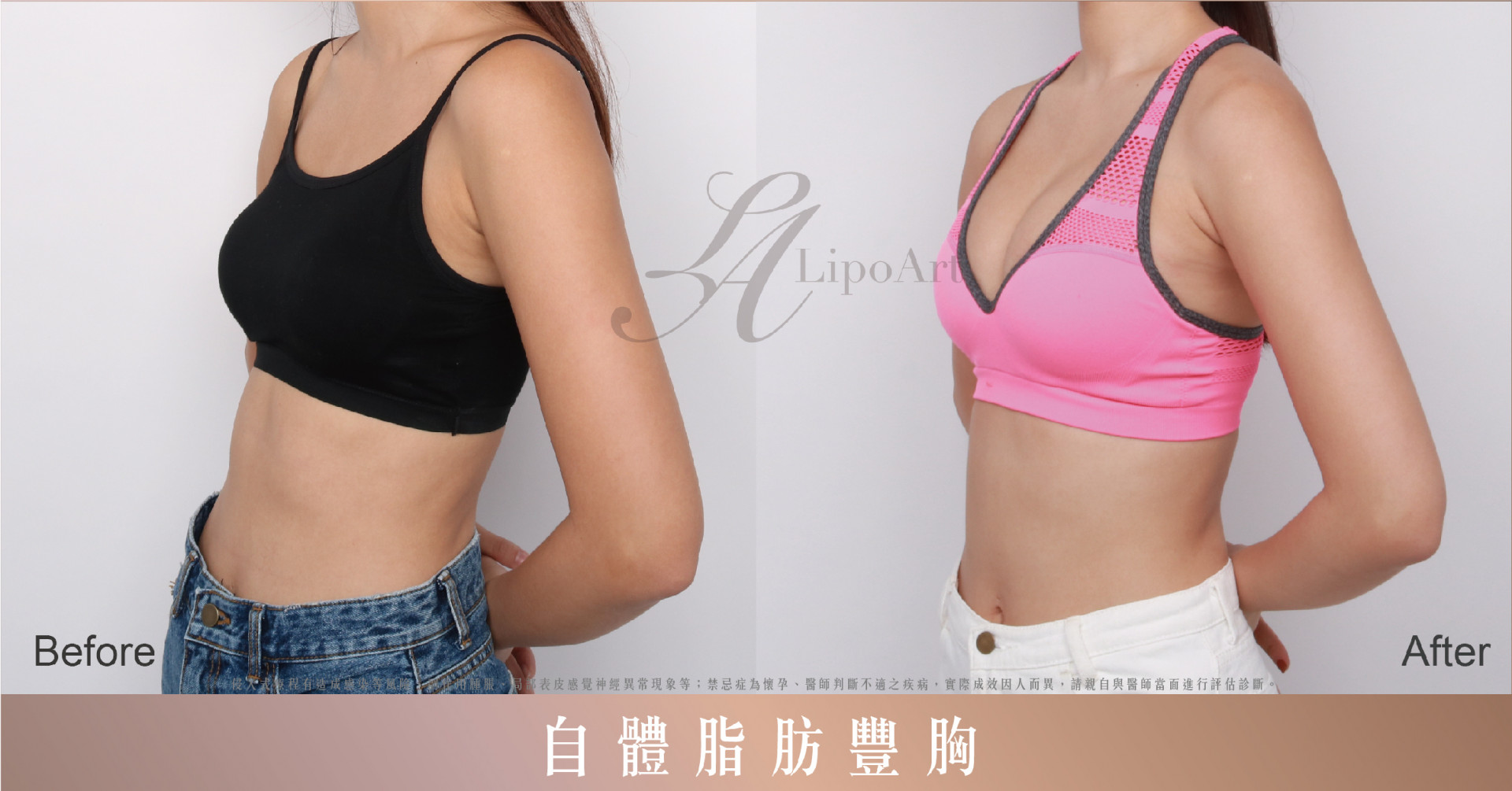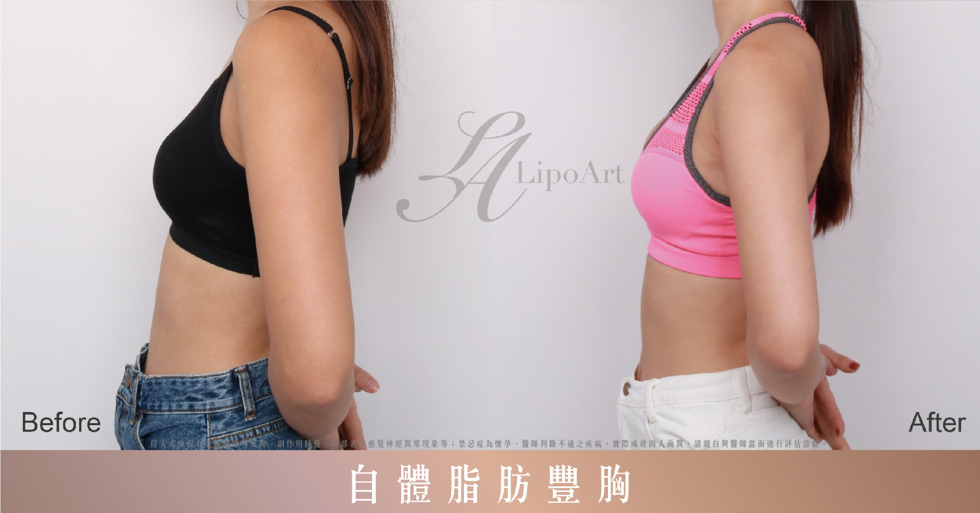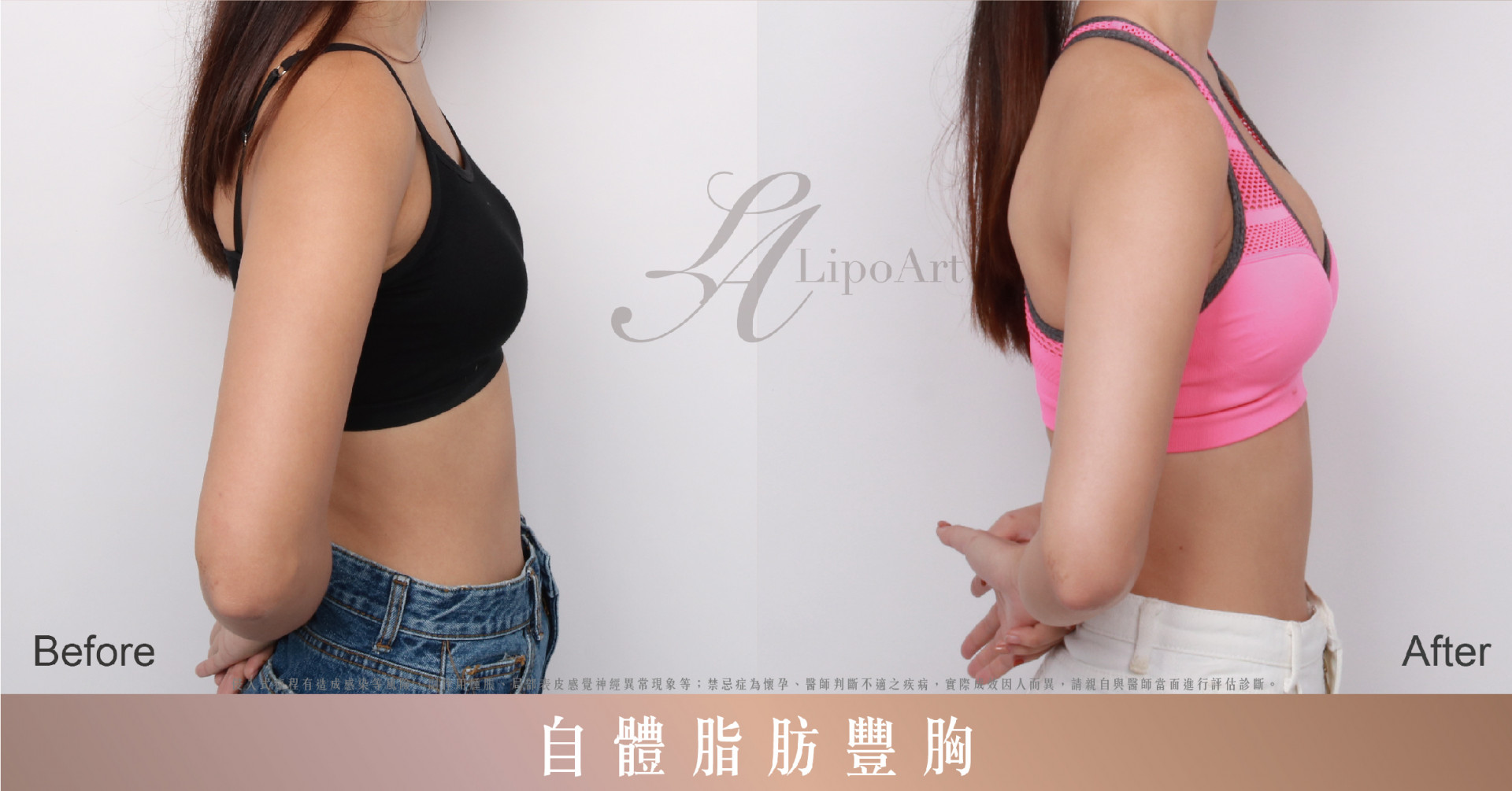 ▲ 術前整體紀錄(右):利用自體脂肪豐胸,將腿部多餘脂肪,經過分量的方式填補在上胸,術後上圍變得豐滿又挺俏。