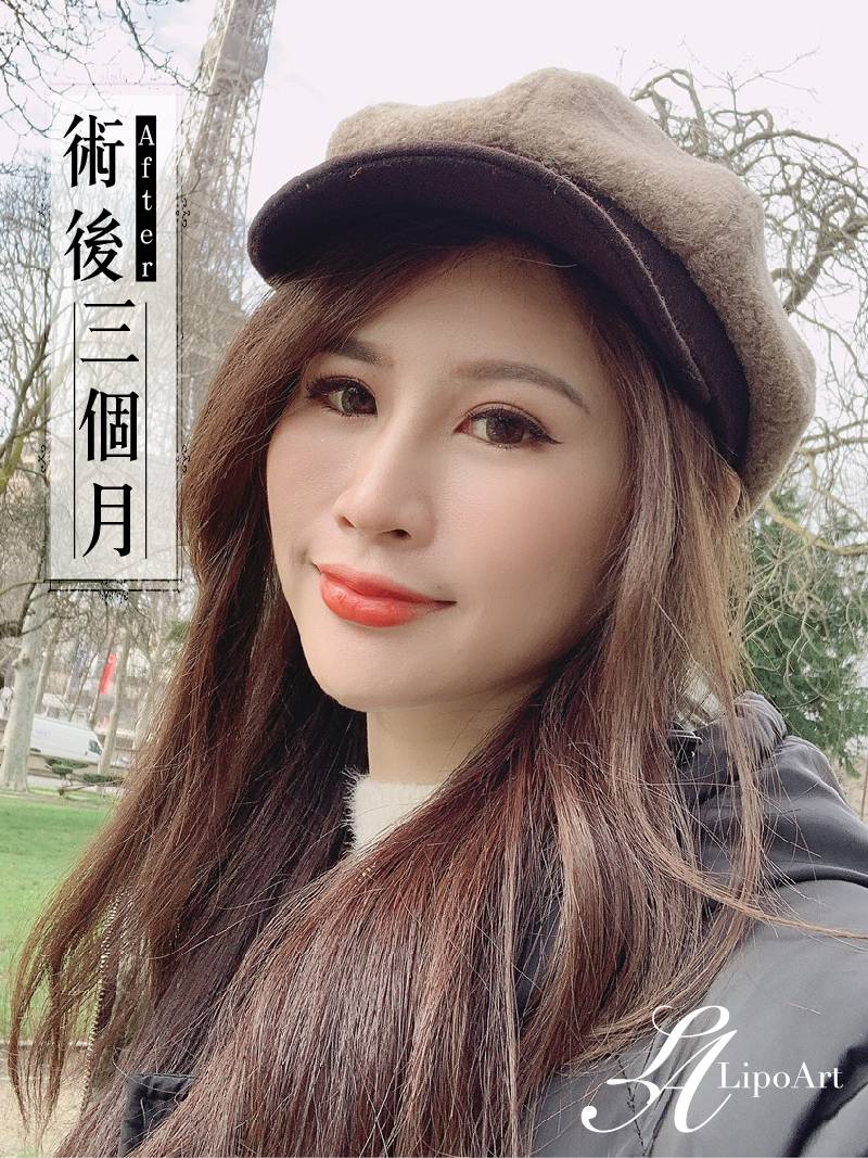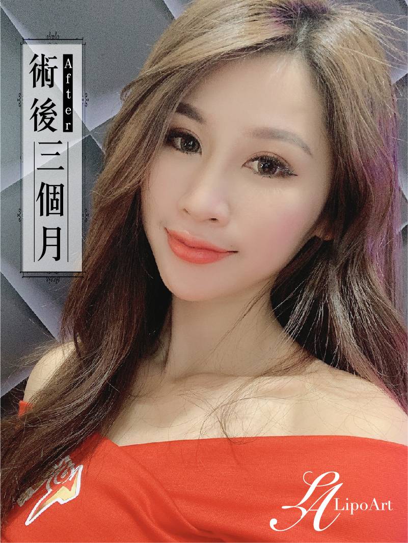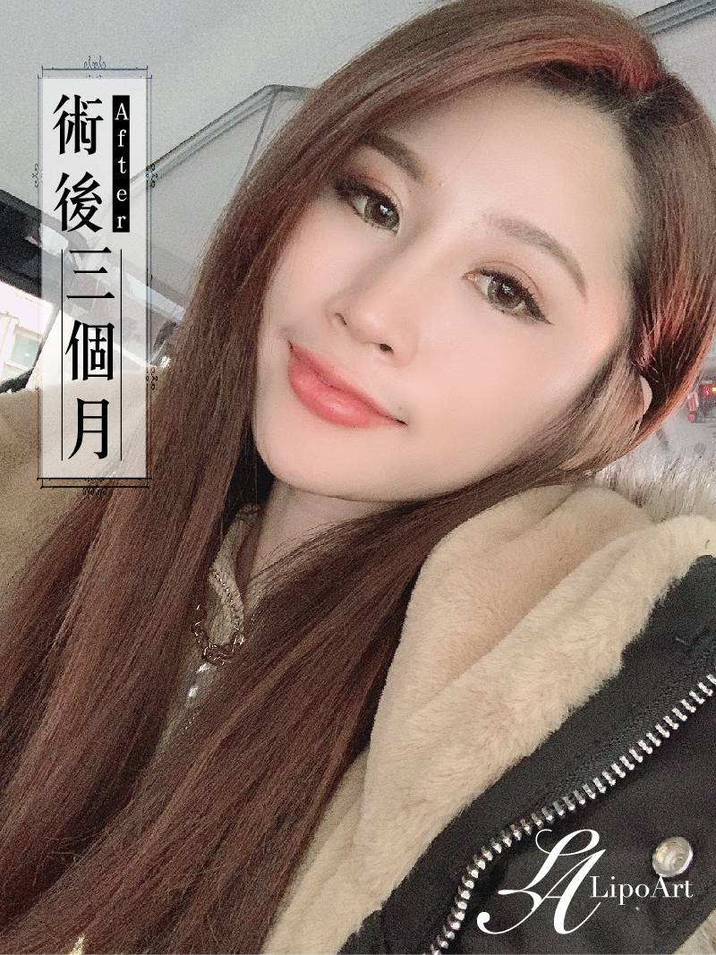 ▲ 術後整體紀錄(右):術後將自體脂肪膠移植,脂肪存活在凹溝中,除有填充效果外,整體臉型也變得更為柔順、立體。