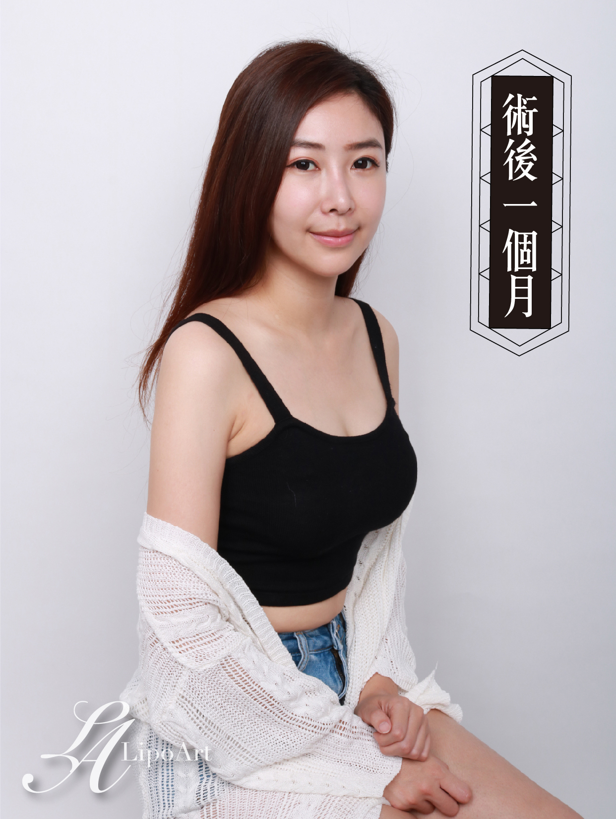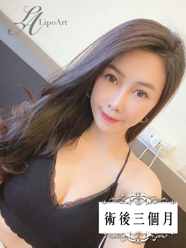 ▲ 術後正面紀錄(右):術後線條顯露無遺,即使身體微前傾,仍可看出水滴狀般的胸型。