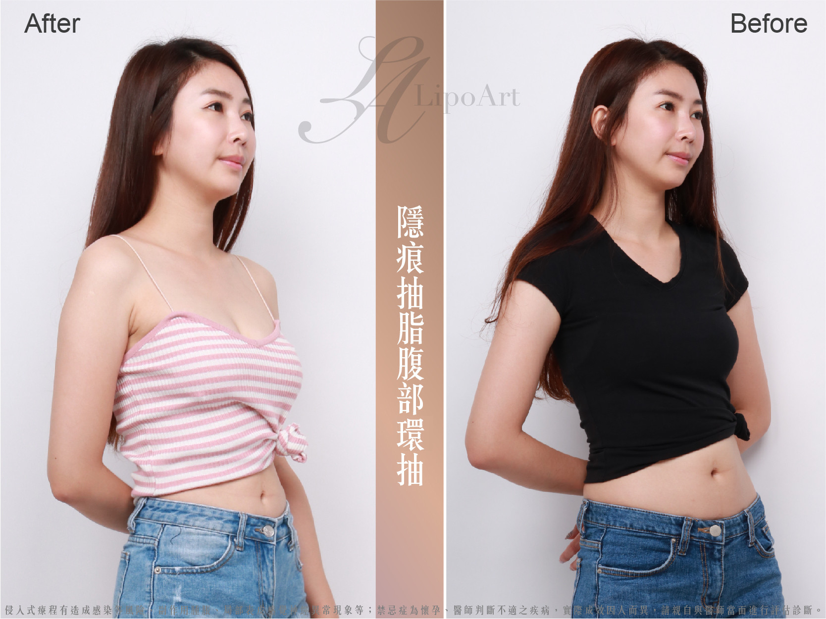 ▲ 術前正面紀錄(左):術前腹部脂肪較厚,缺乏纖細曲線感。
