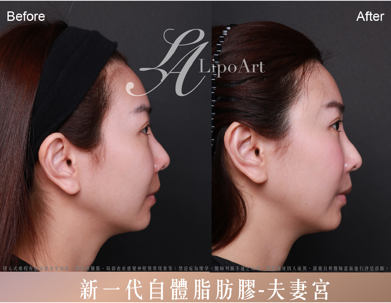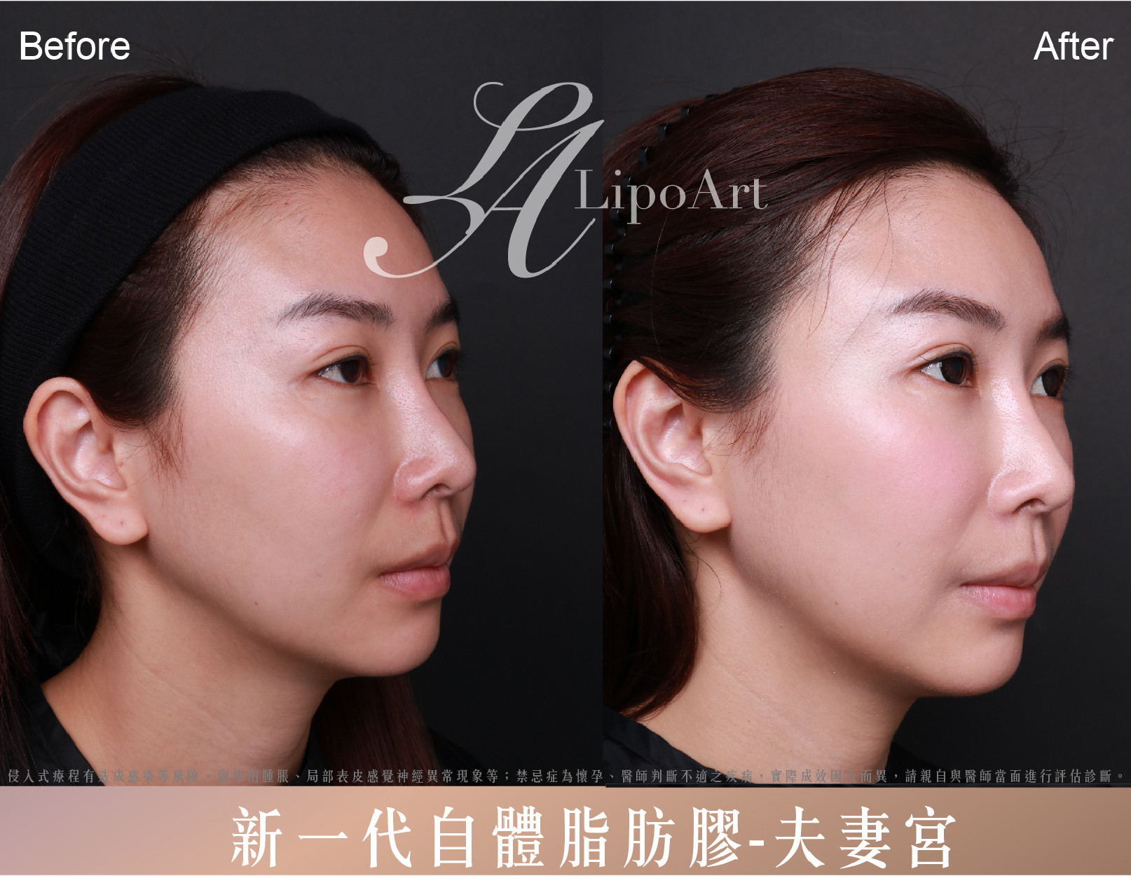 ▲術後整體紀錄(右):術後透過皮下注射自體脂肪膠,使凹陷處明顯平坦,臉部線條也更為柔順。