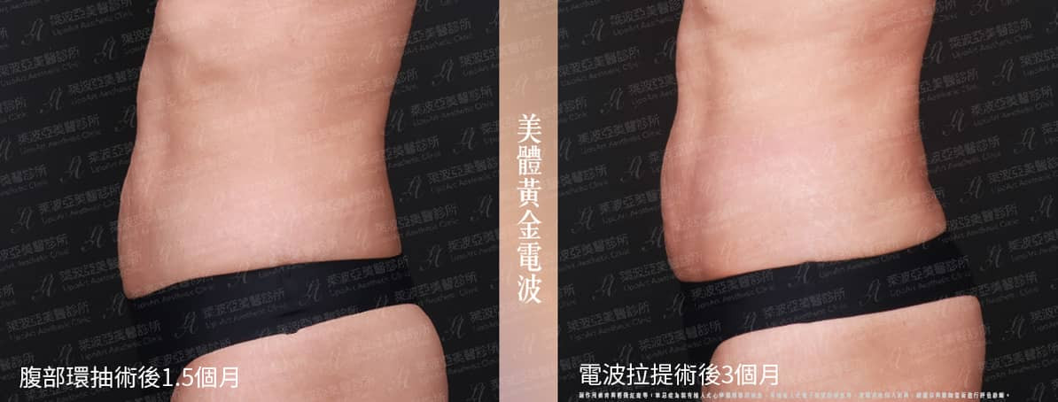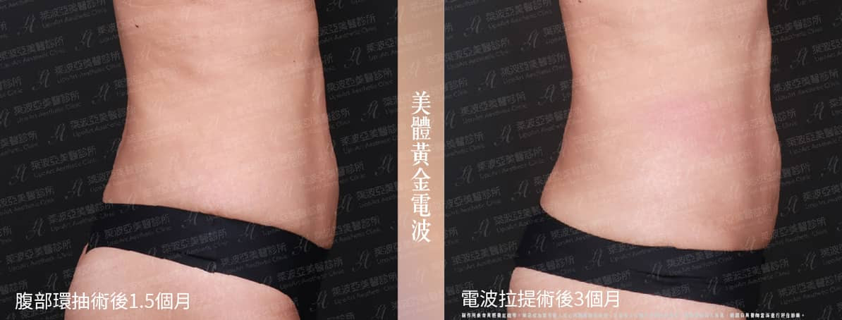 ▲術後整體紀錄(右):透過第四代電波拉提,使腹部肌膚獲得拉提,產後造成的下垂與抽脂後的鬆弛部位得到顯著改善,整體線條也更為緊實。