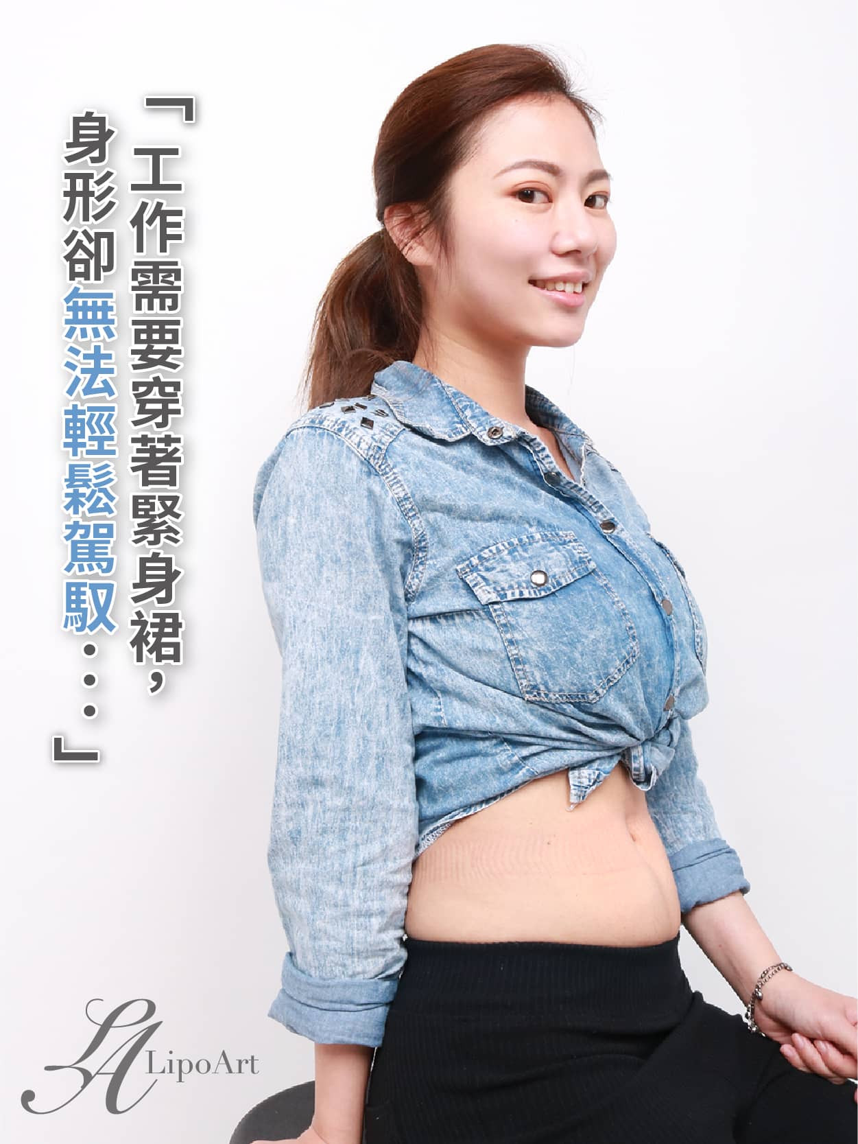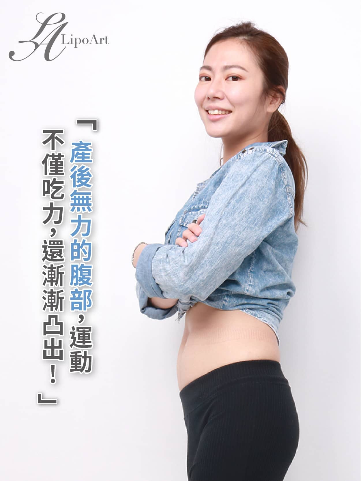 ▲術前整體紀錄(左):無力鬆弛的腹部,即使用力吸氣,肚子還是明顯凸出,感受不到緊實感。
