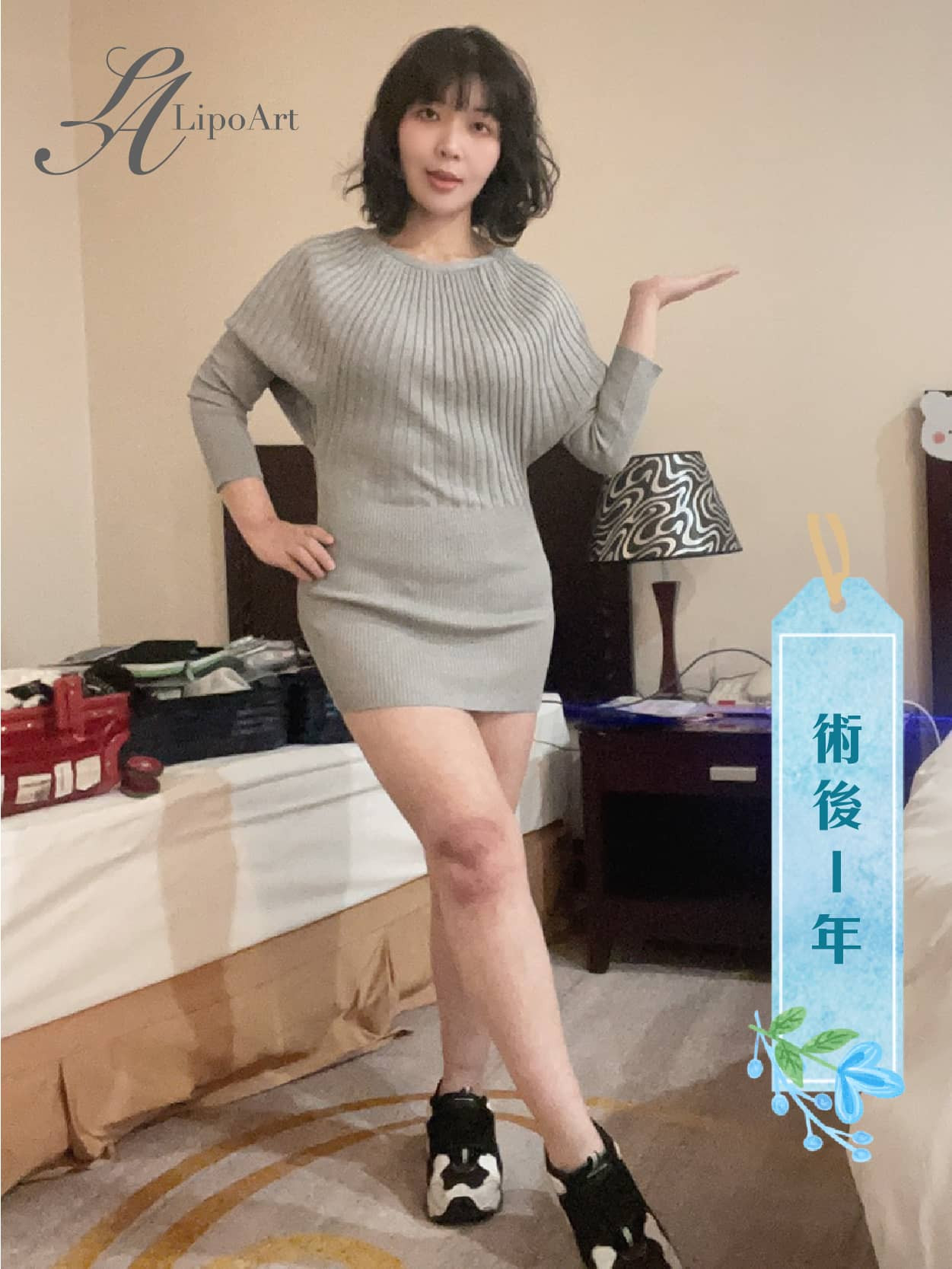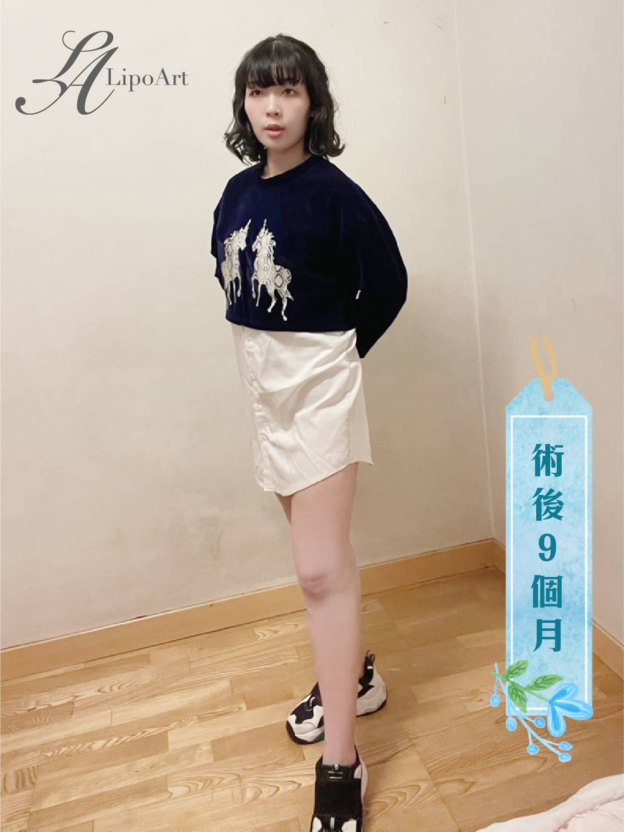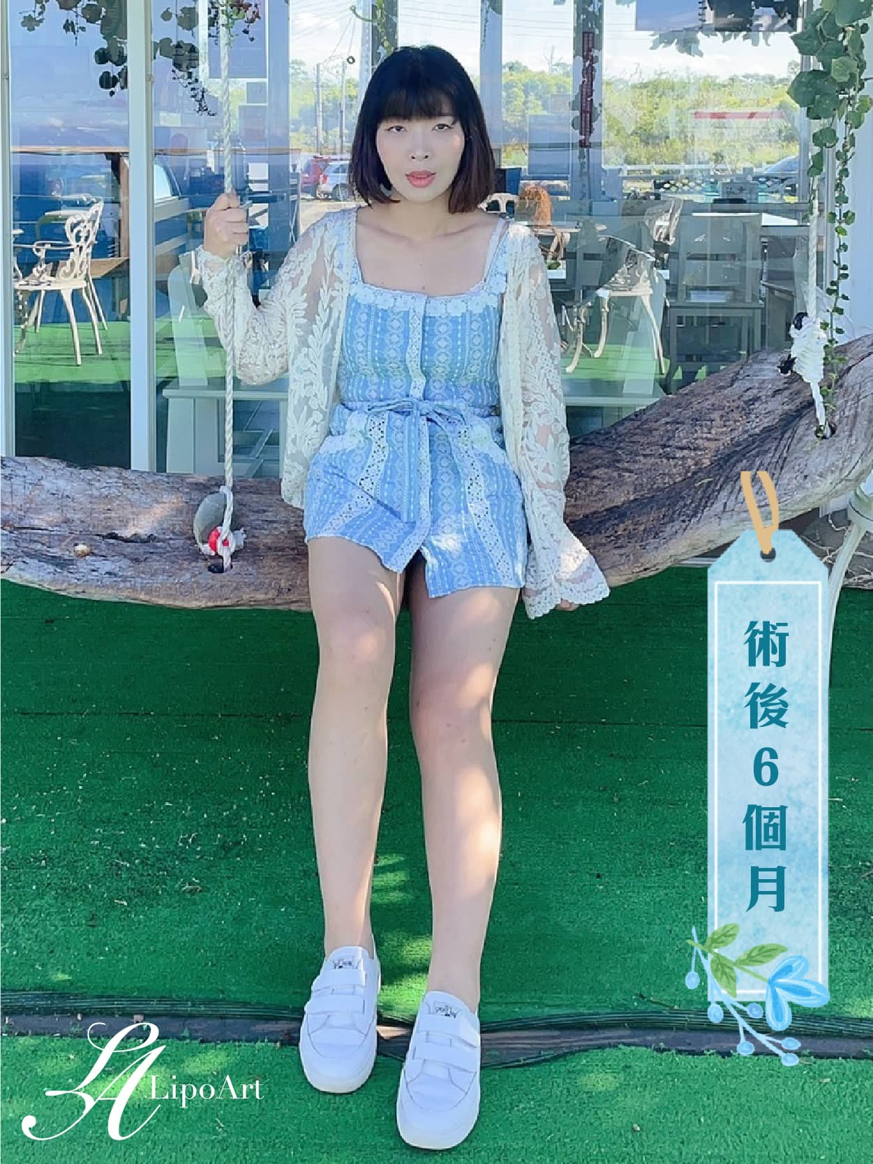 ▲術後正面紀錄(右):術後往外擴張的大腿不僅向內收縮,鬆弛感也不見了,大腿縫隙變的明顯後,腿部的視覺線條也更顯筆直、修長。