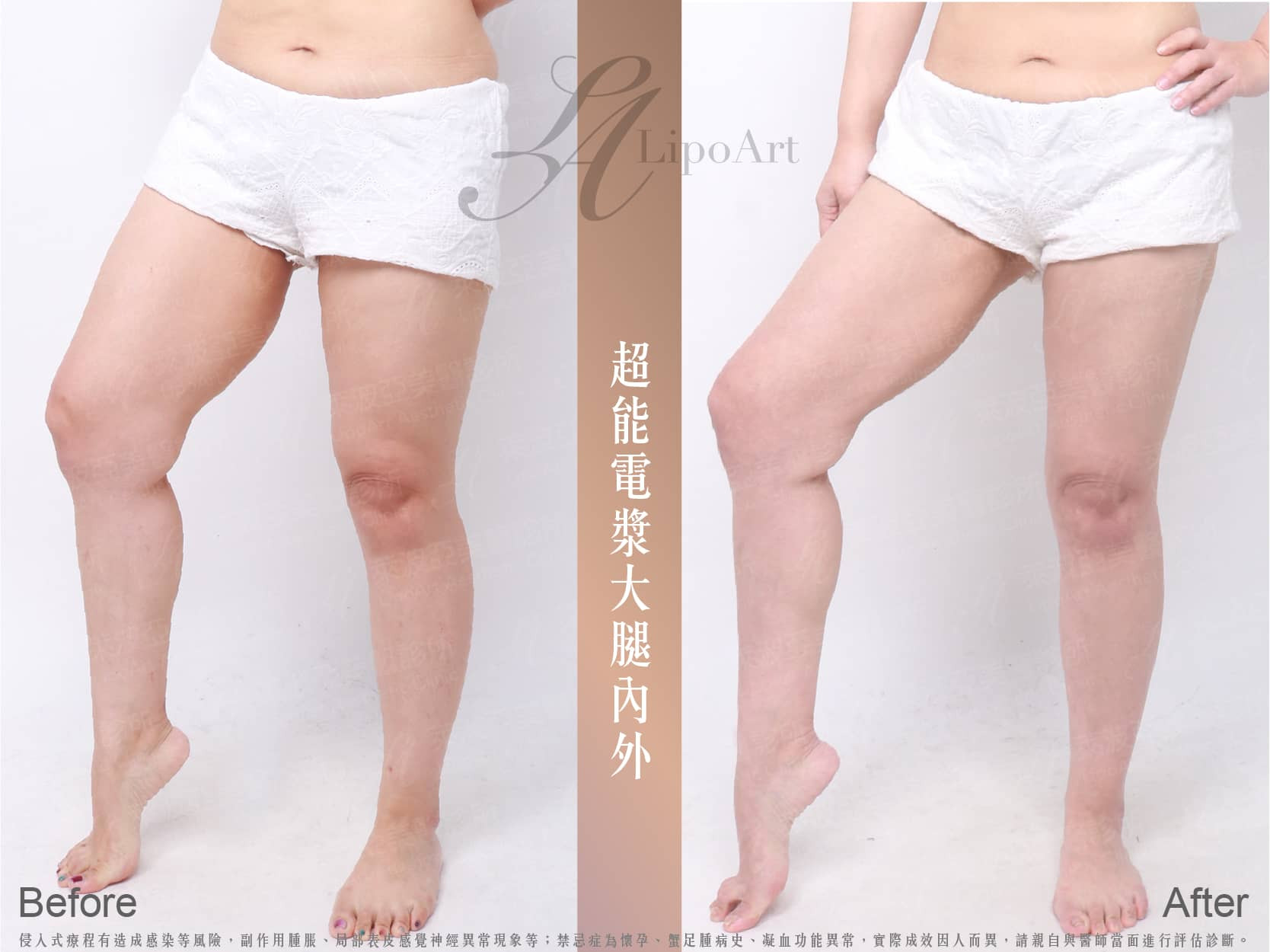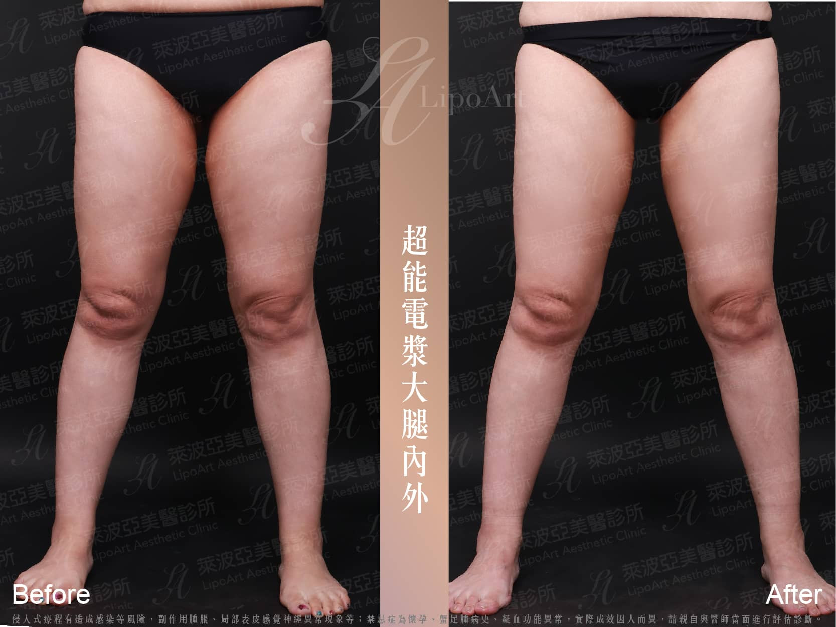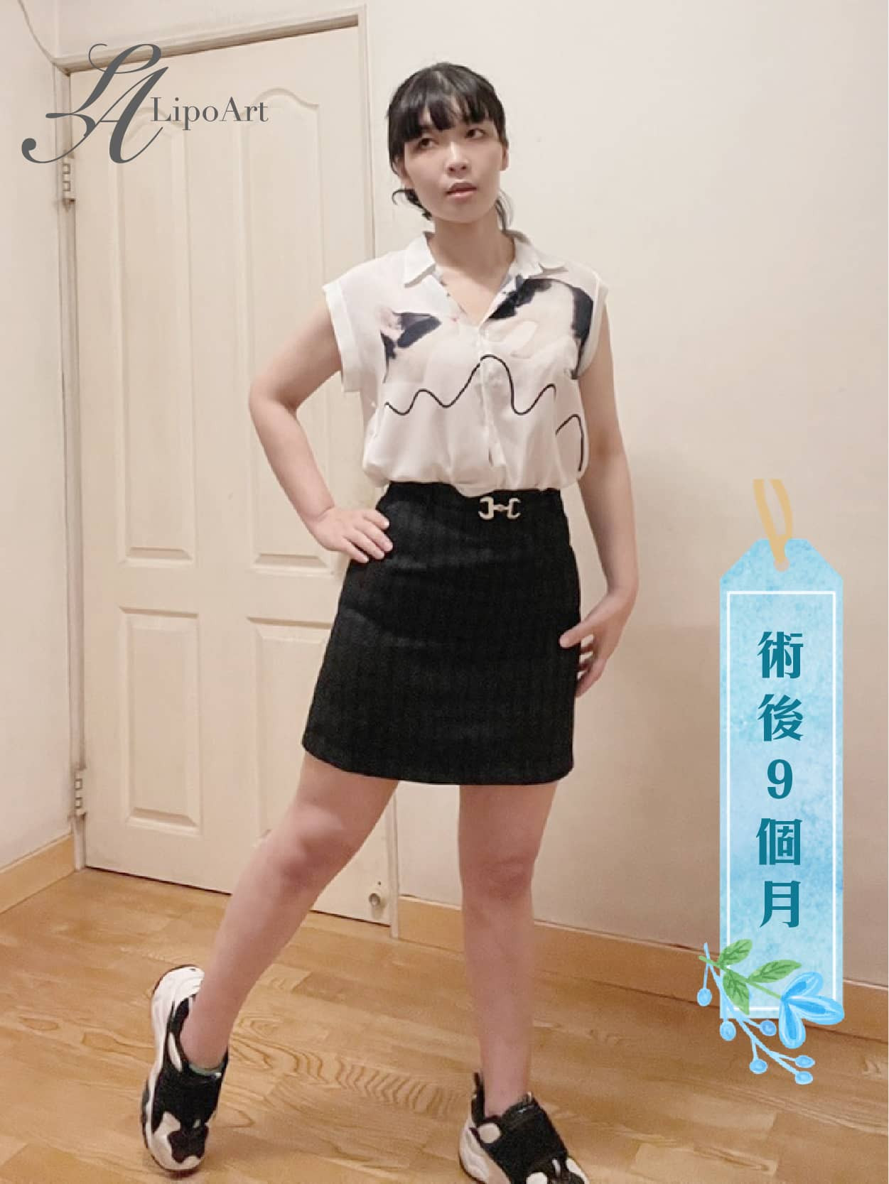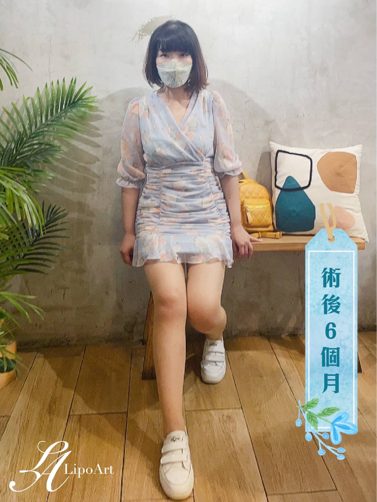 ▲術後正面紀錄(右):術後往外擴張的大腿不僅向內收縮,鬆弛感也不見了,大腿縫隙變的明顯後,腿部的視覺線條也更顯筆直、修長。