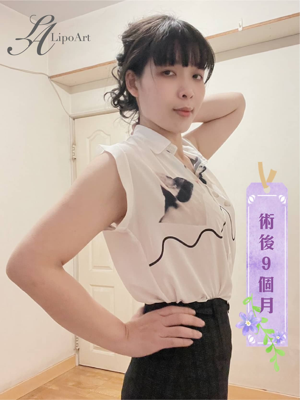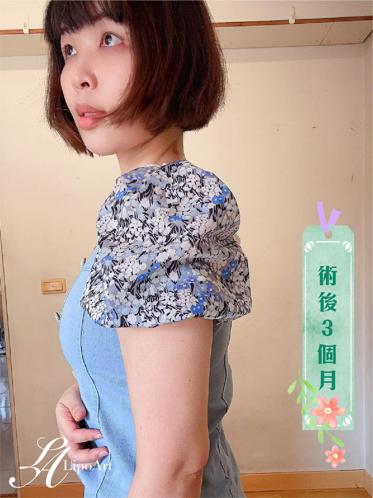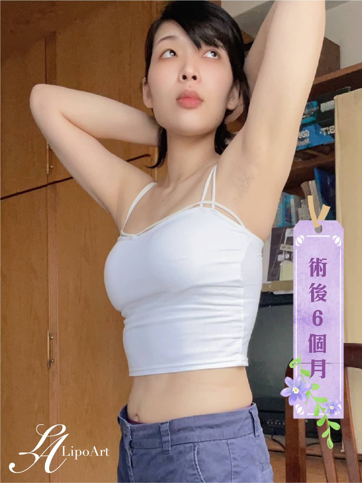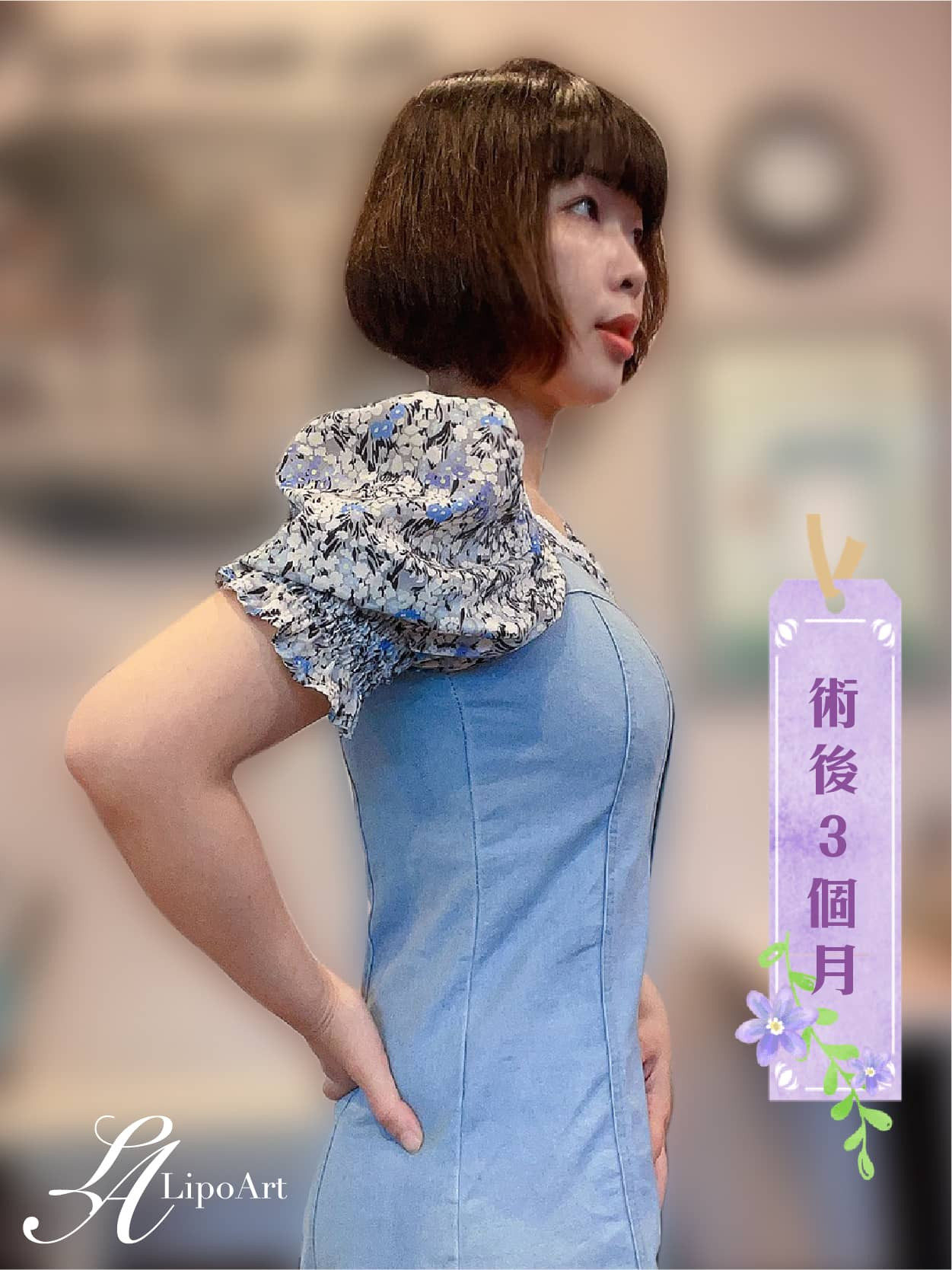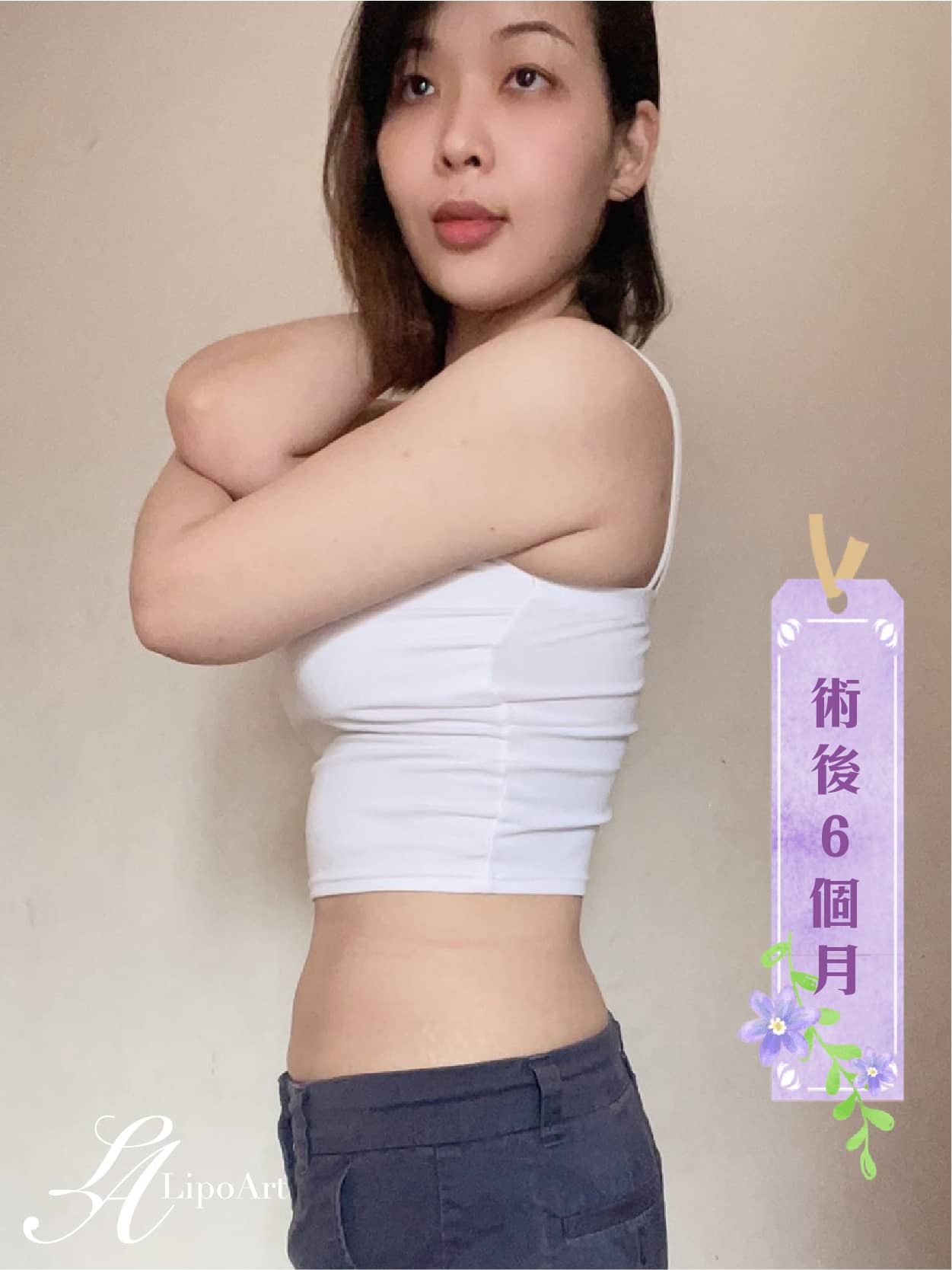 ▲術後側面紀錄(右):術後可看見腋下贅皮及掰掰袖的部分往上收,手臂內側紋理變得緊實,線條也變得更有活力、健美。