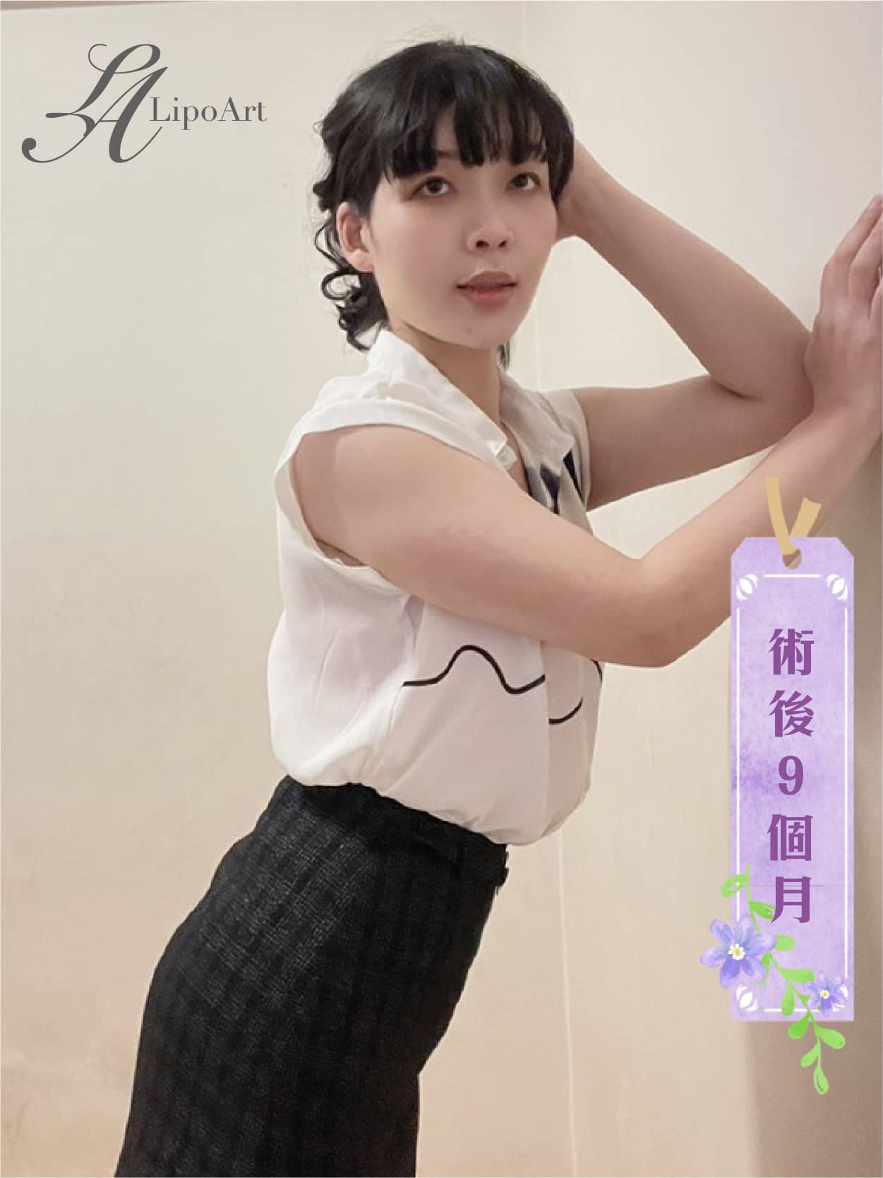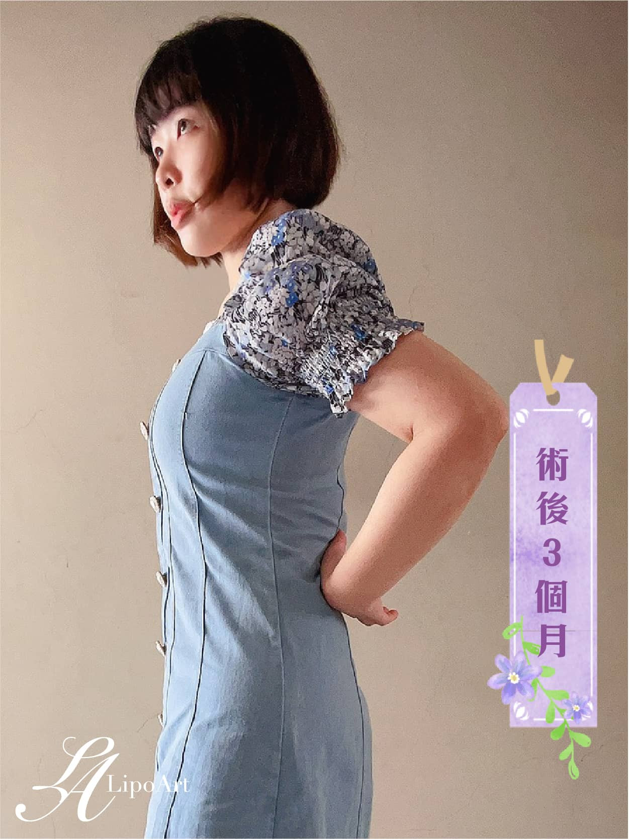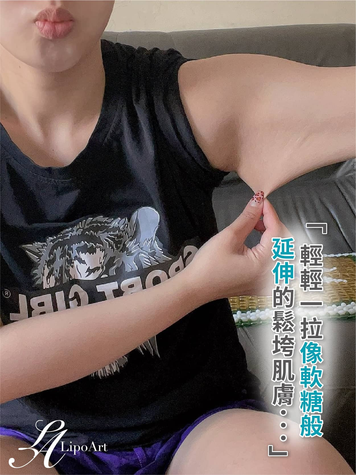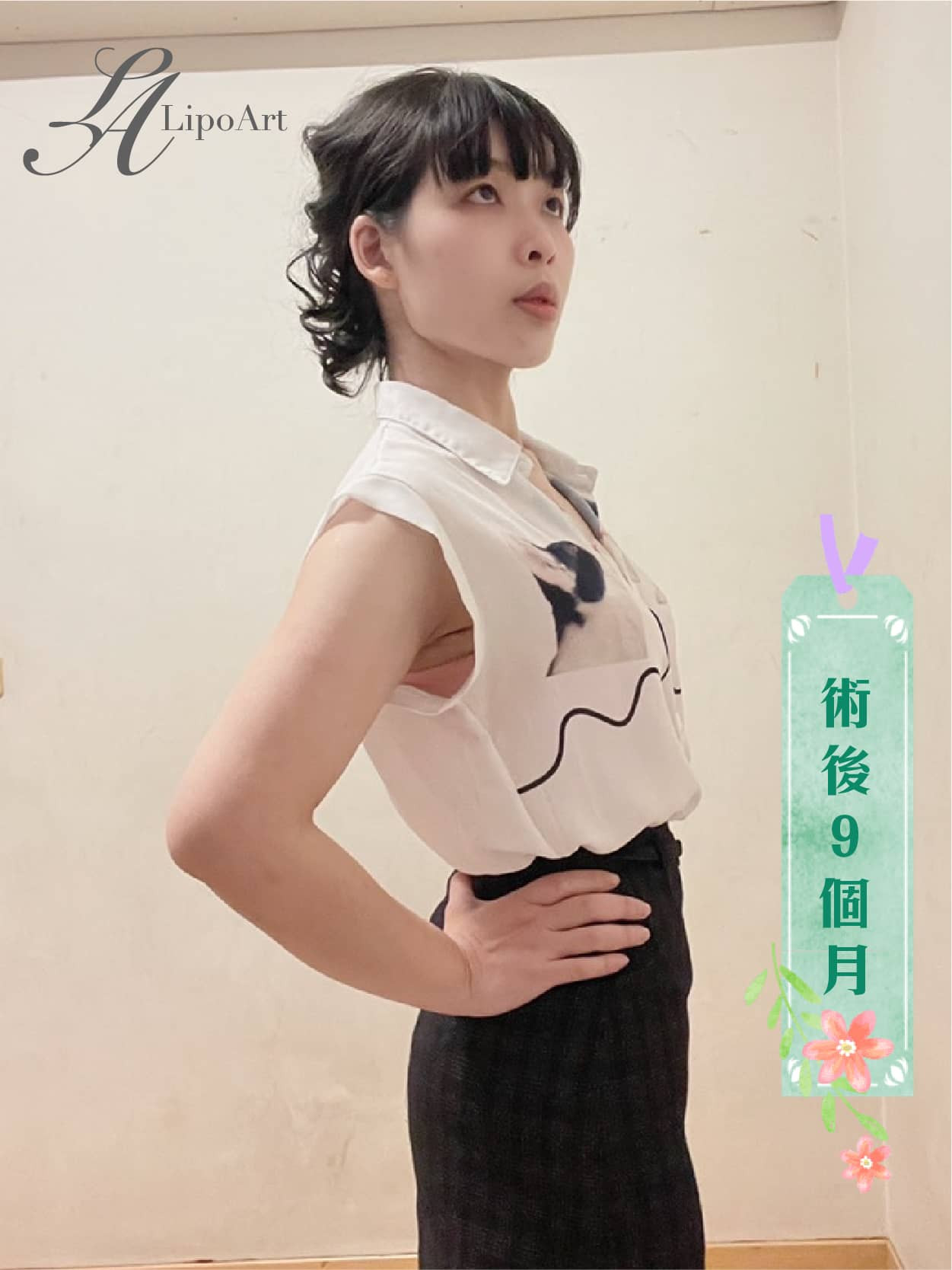 ▲術後側面紀錄(右):術後可看見腋下贅皮及掰掰袖的部分往上收,手臂內側紋理變得緊實,線條也變得更有活力、健美。