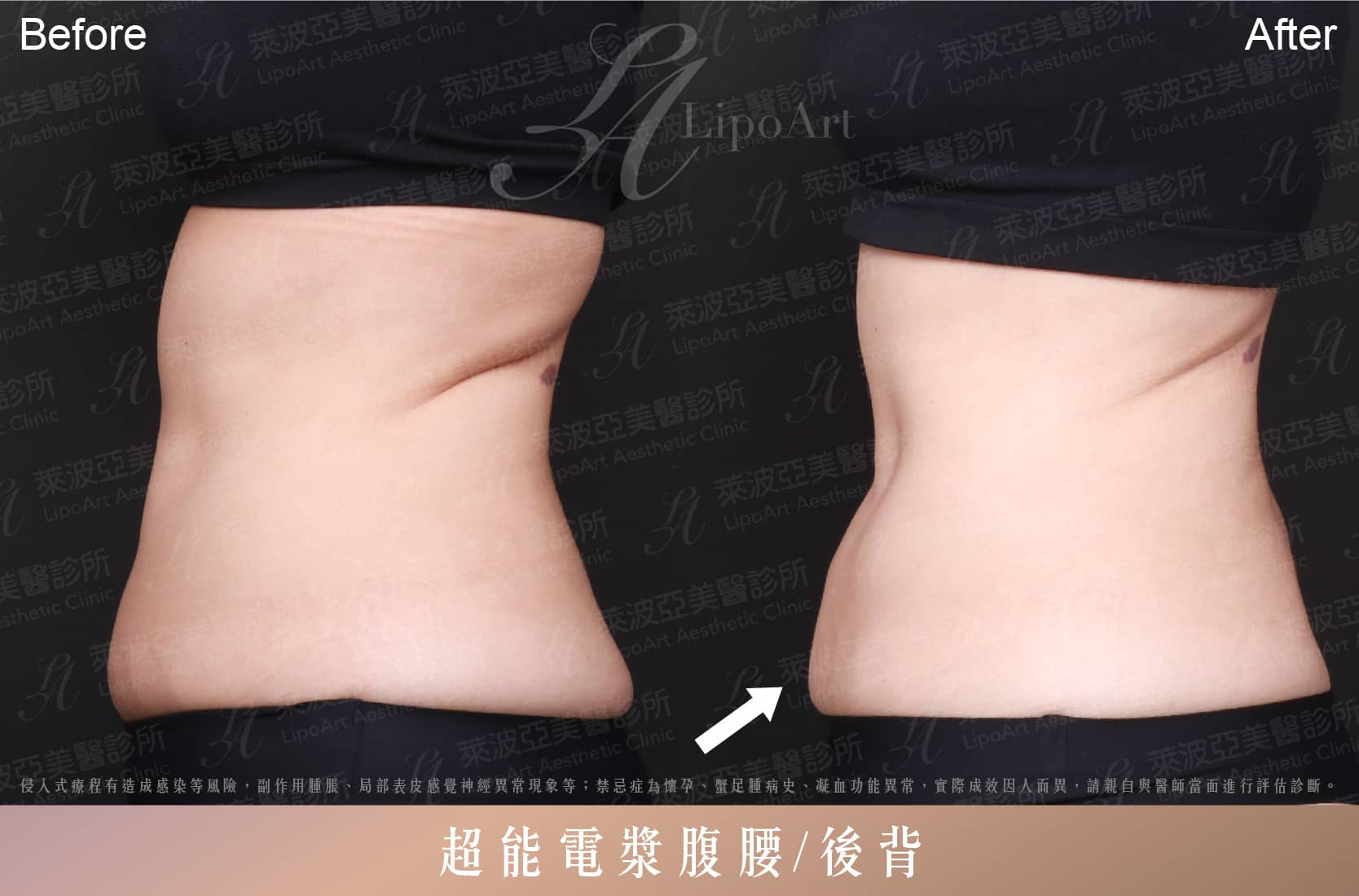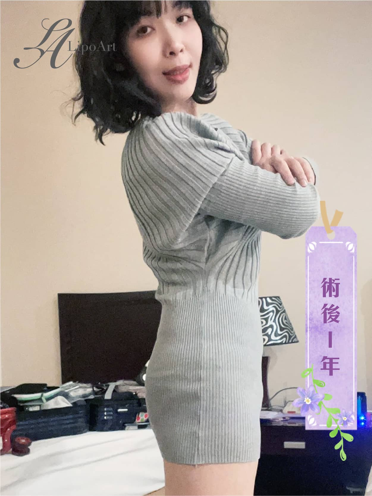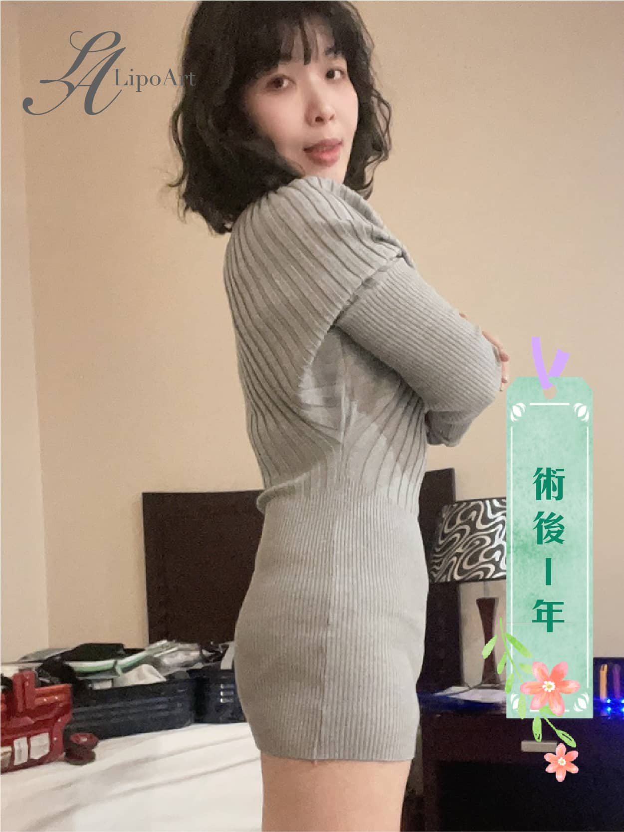 ▲術後側面90度紀錄(右):可看出上腹明顯收緊,凸起的下腹內縮,原本下垂的下背肉與突出的臀上肉也收回去,背部皺褶不僅獲得顯著改善,也讓整體腰圍縮小,腹部川字線條陰影更顯深邃。