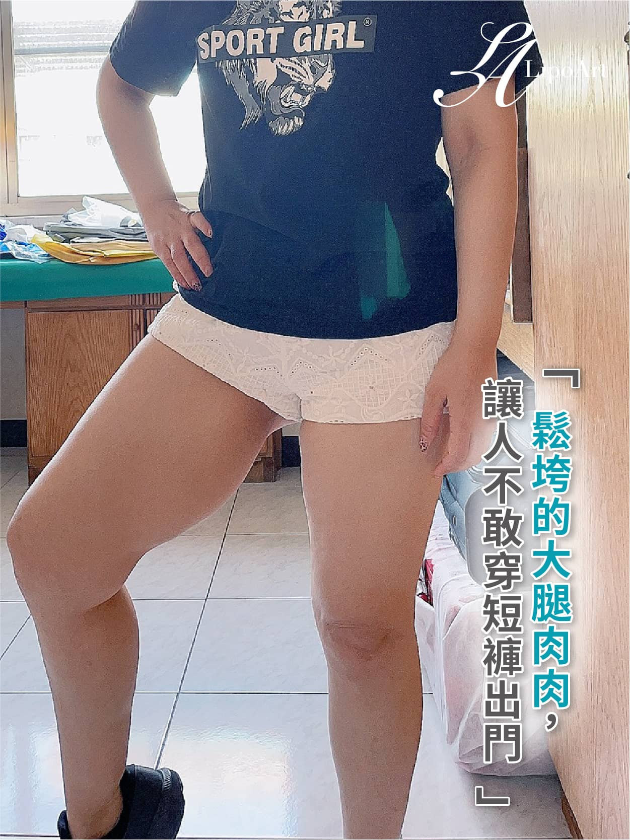 ▲術前正面紀錄(左):術前大腿內、外側明顯澎出一塊且往下墜,而失去彈性的皮膚,也大腿兩側線條外觀看起來變的凹凸不平。