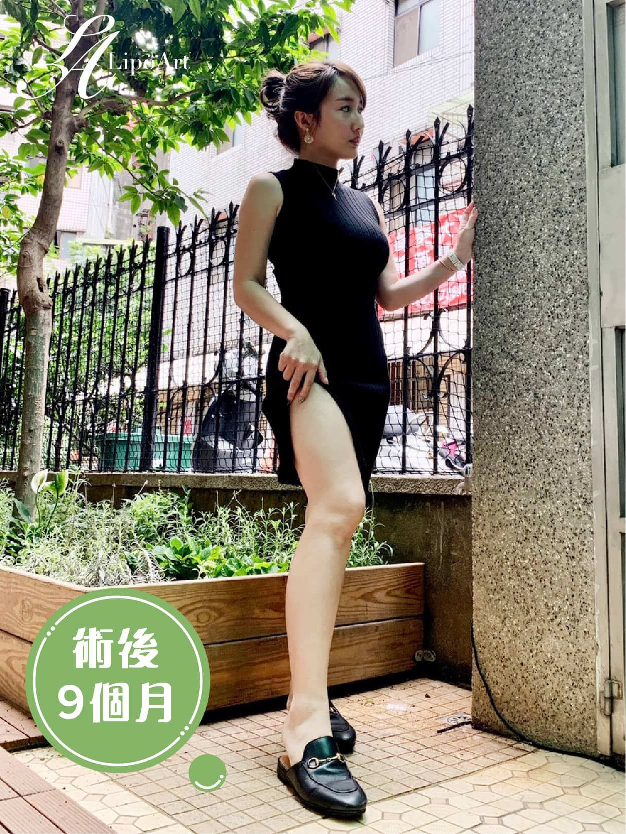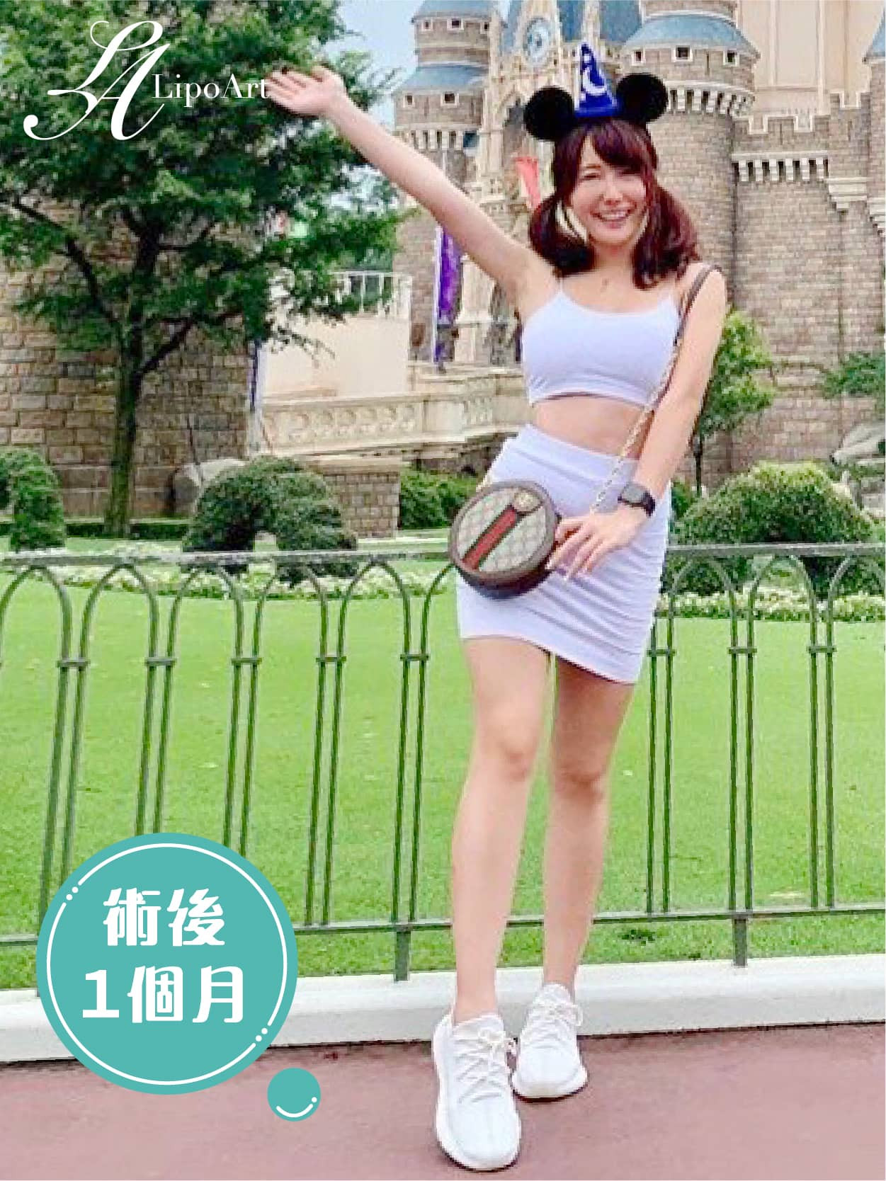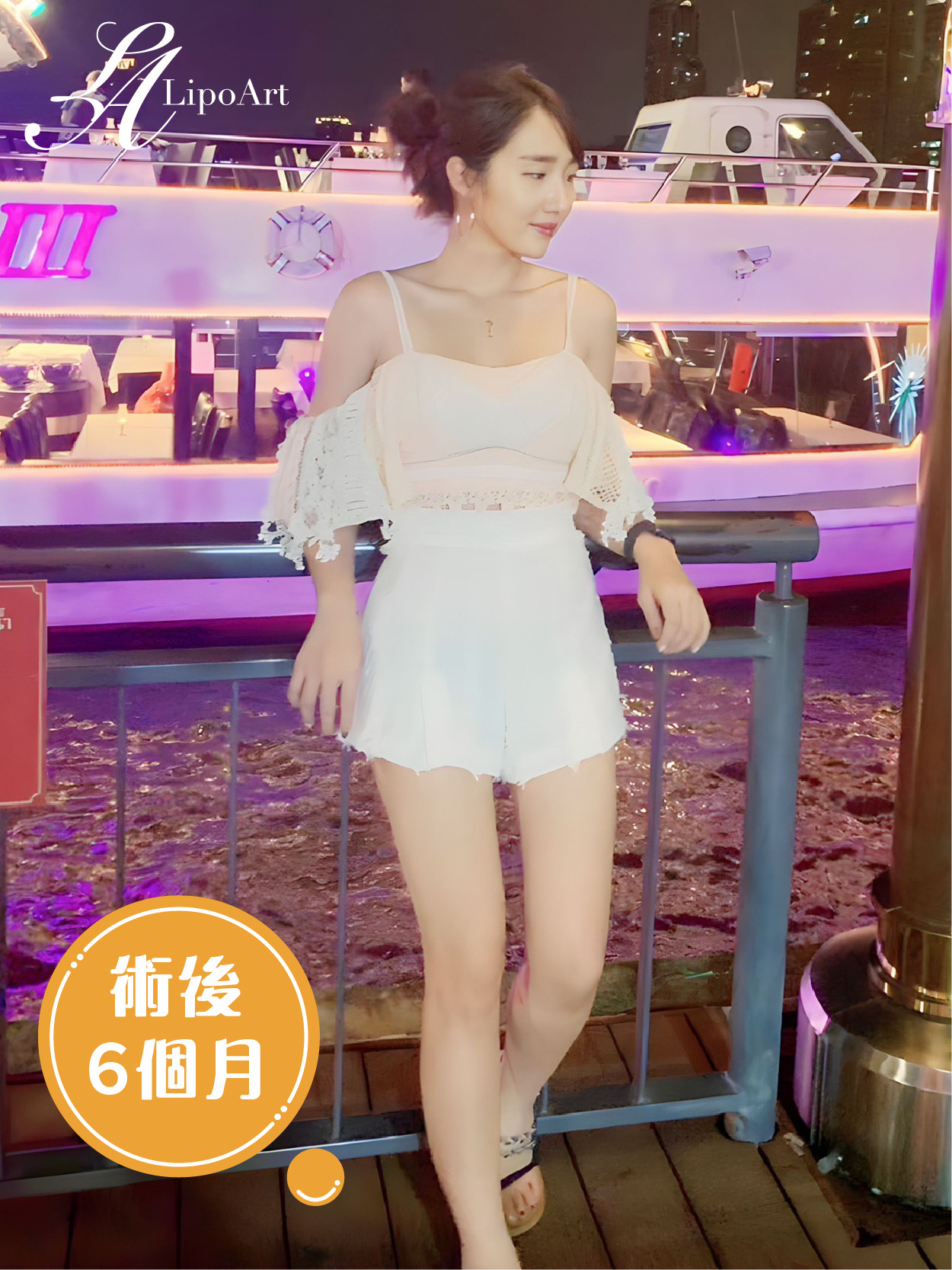 術後正面紀錄(右):後移除大腿多餘脂肪,下半身曲線穠纖合度,呈現常見於模特的H身形,視覺上整體尺寸明顯縮小一號。