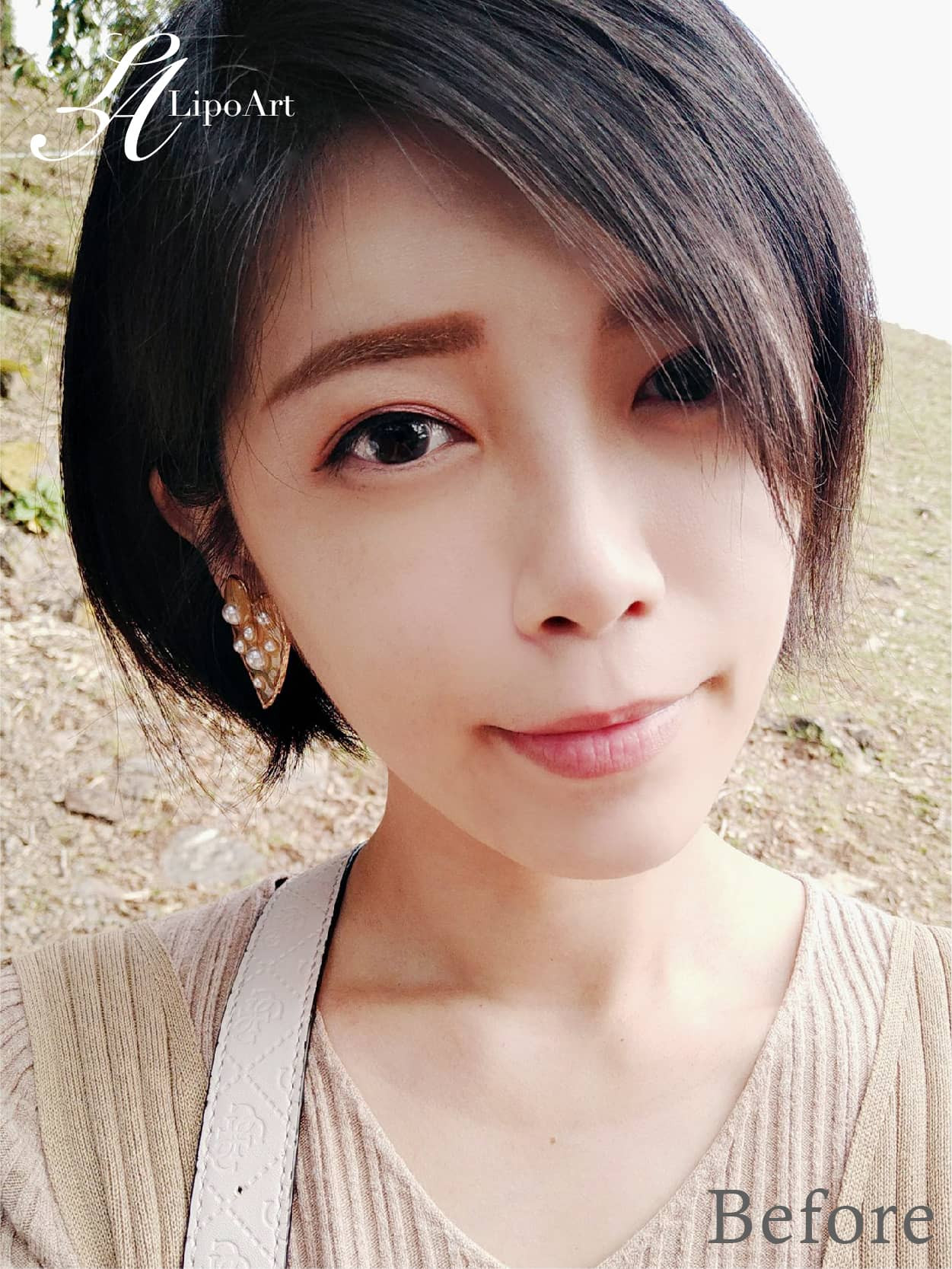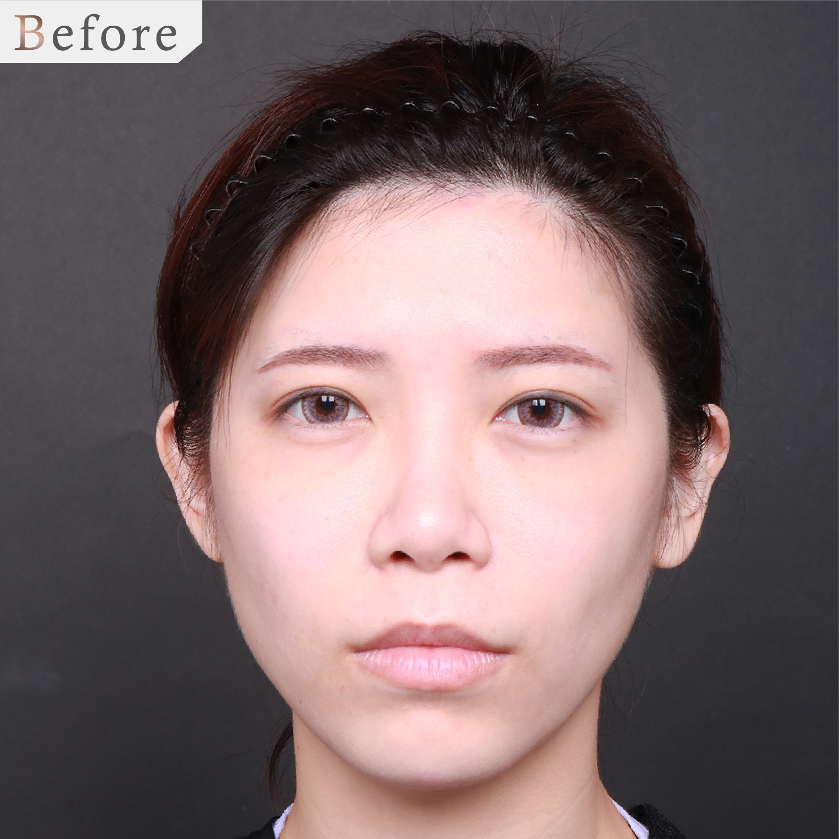 術前整體紀錄(左):下巴比例偏短小方正,使得臉部整體視覺效果外擴不夠集中,無法突顯五官精緻度。