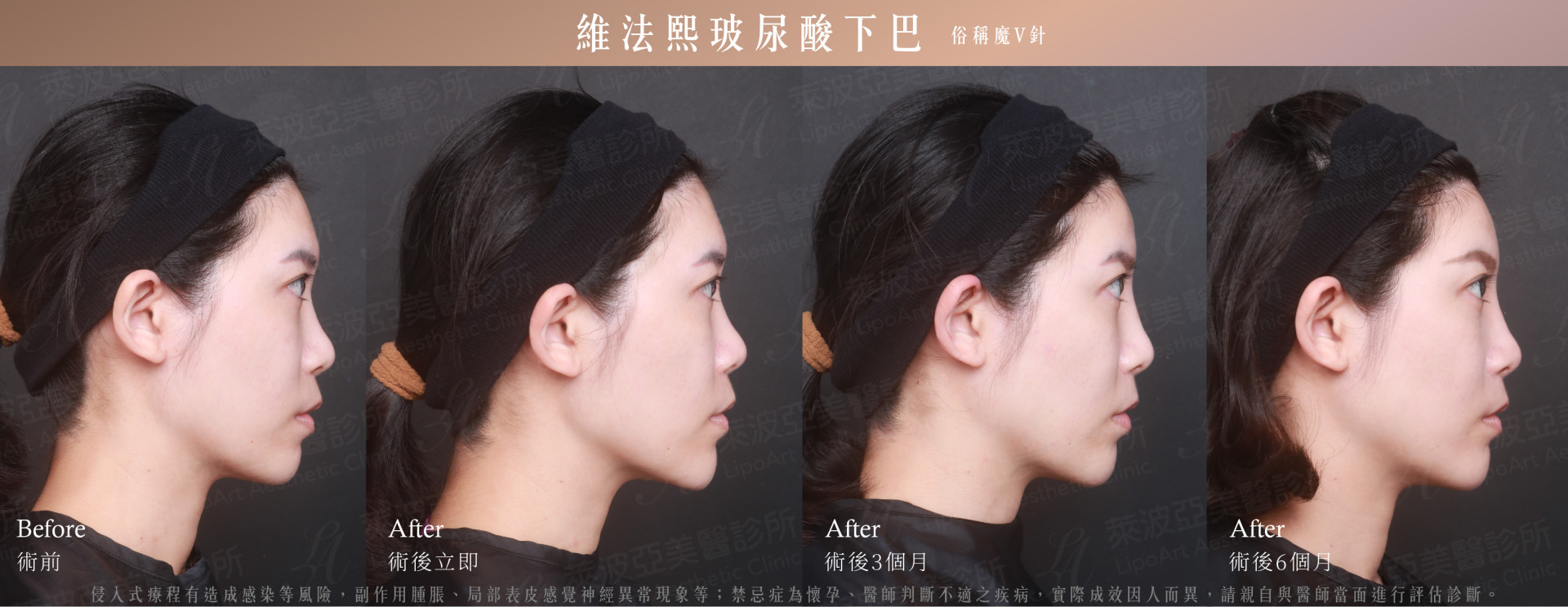 術後整體紀錄(右):精細規劃臉部比例,術後立即能感受到下巴比例延伸,術後三個月臉型顯得V型修長,術後六個月支撐效果依然維持得很好!