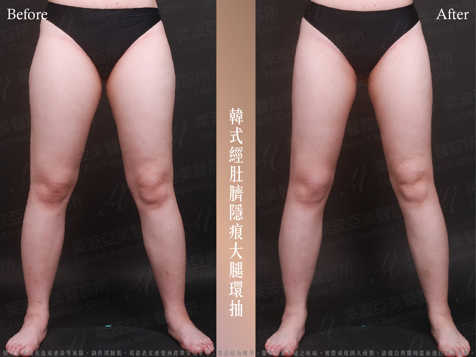 術後(右):外側線條變滑順,腿內間隙出現,整體視覺更為纖細筆直。
