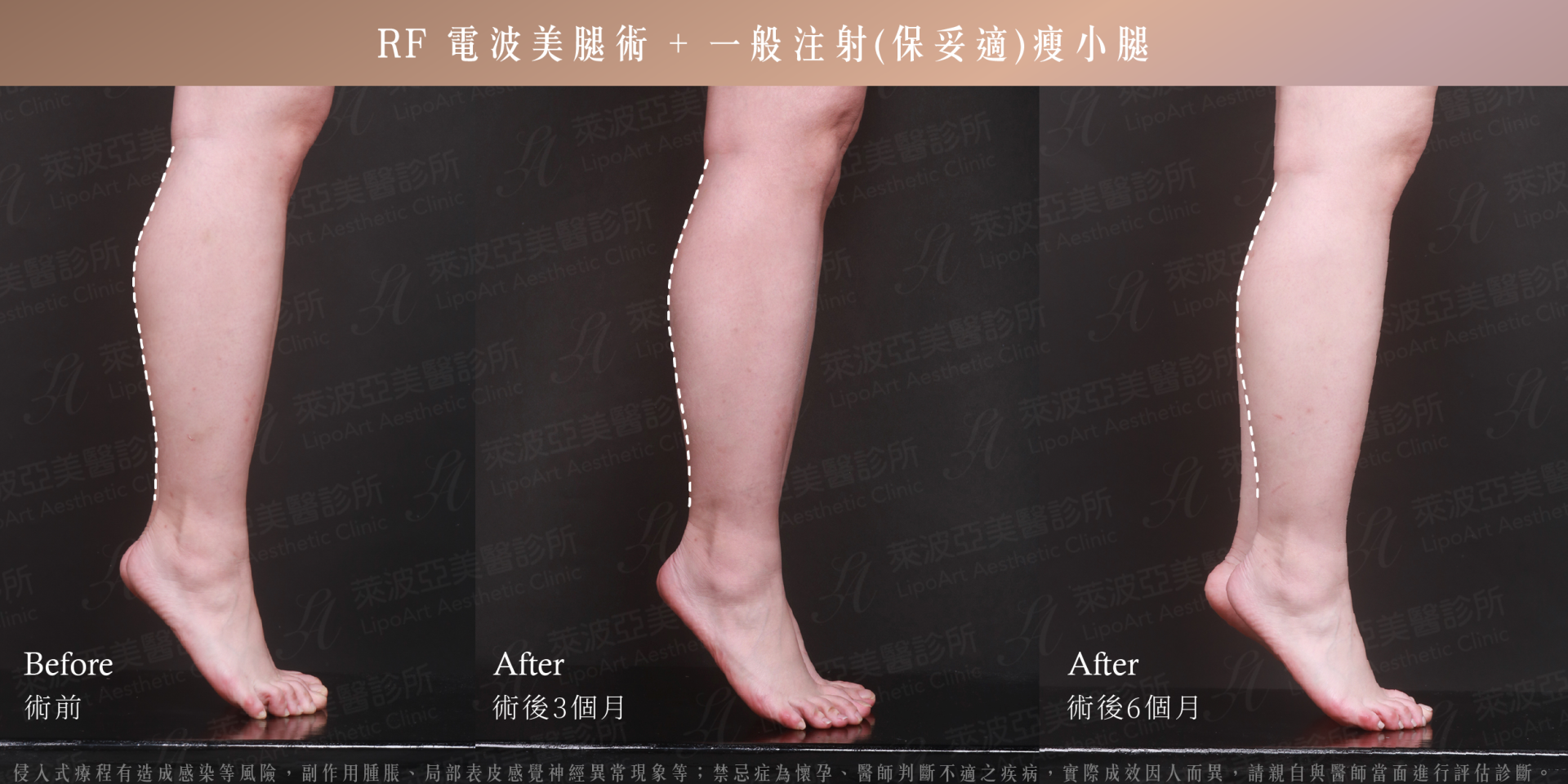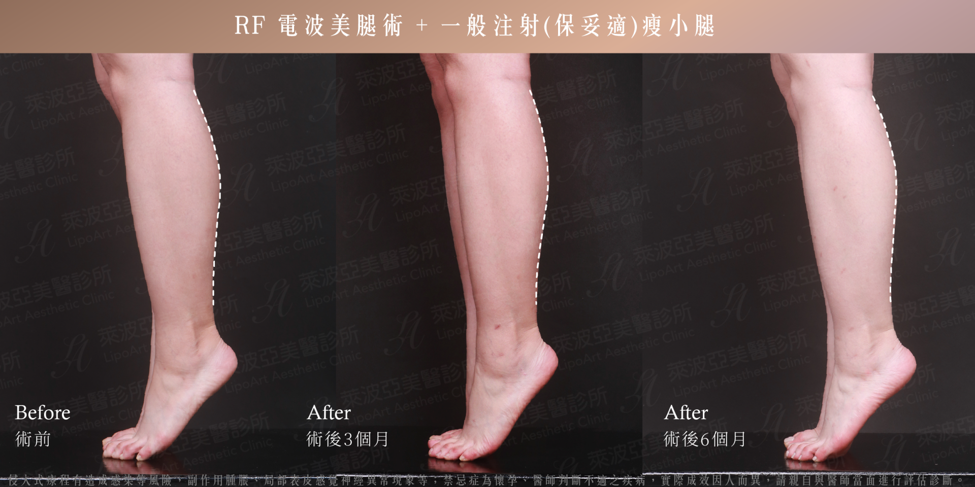 因抽大腿與瘦小腿的效果,都是循序漸進的,隱痕抽脂後需等待約三個月的時間,讓水腫完全消退,就能收獲漂亮線條!而 RF 電波美腿術 + 一般注射(保妥適)瘦小腿則是在術後 2 ~ 4 周即能看見改變!