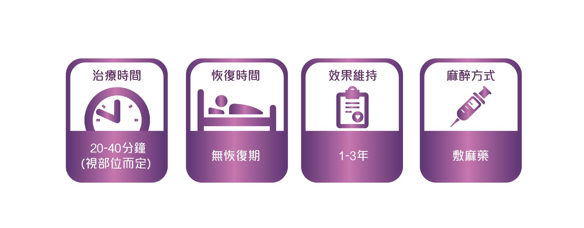 A:須根據每個人的體質、年齡、生活習慣、不同的施打部位及範圍會有不同劑量及劑型的需求。須經由醫師評估,與醫師討論後才能確定。