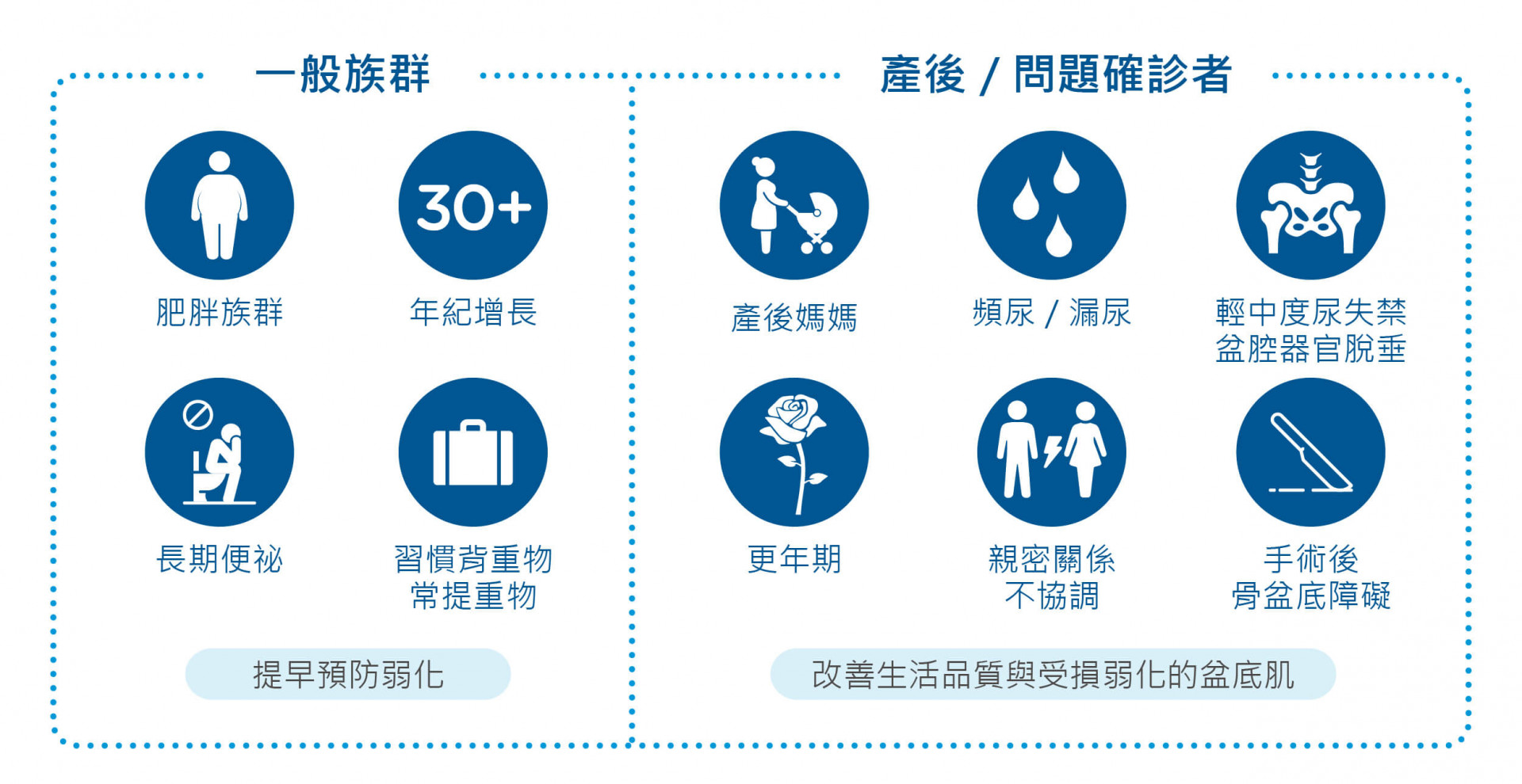 - 欲提早預防骨盆底肌老化、強化盆底肌肉者:預防勝於治療,維持健康骨盆底肌。