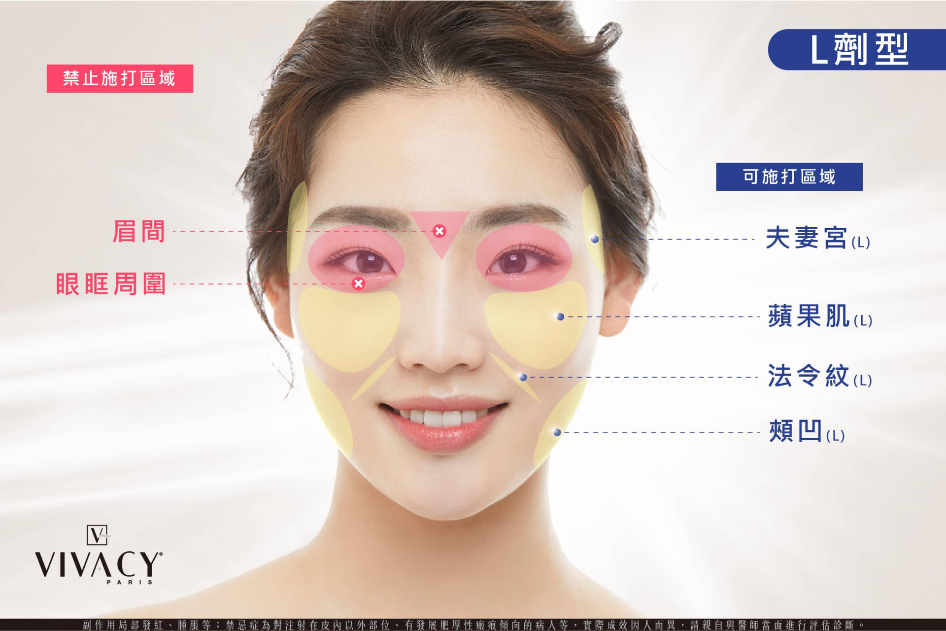 - VIVACY – L劑型:Vivacy 維法熙玻尿酸 L 劑型,屬於中分子玻尿酸,經常運用於矯正深層皺紋,及面部體積填充。如夫妻宮凹陷、頰凹、蘋果肌扁平,或是各種深層紋路,如:法令紋(鼻唇溝)等,術後皆擁有極佳的效果呈現。