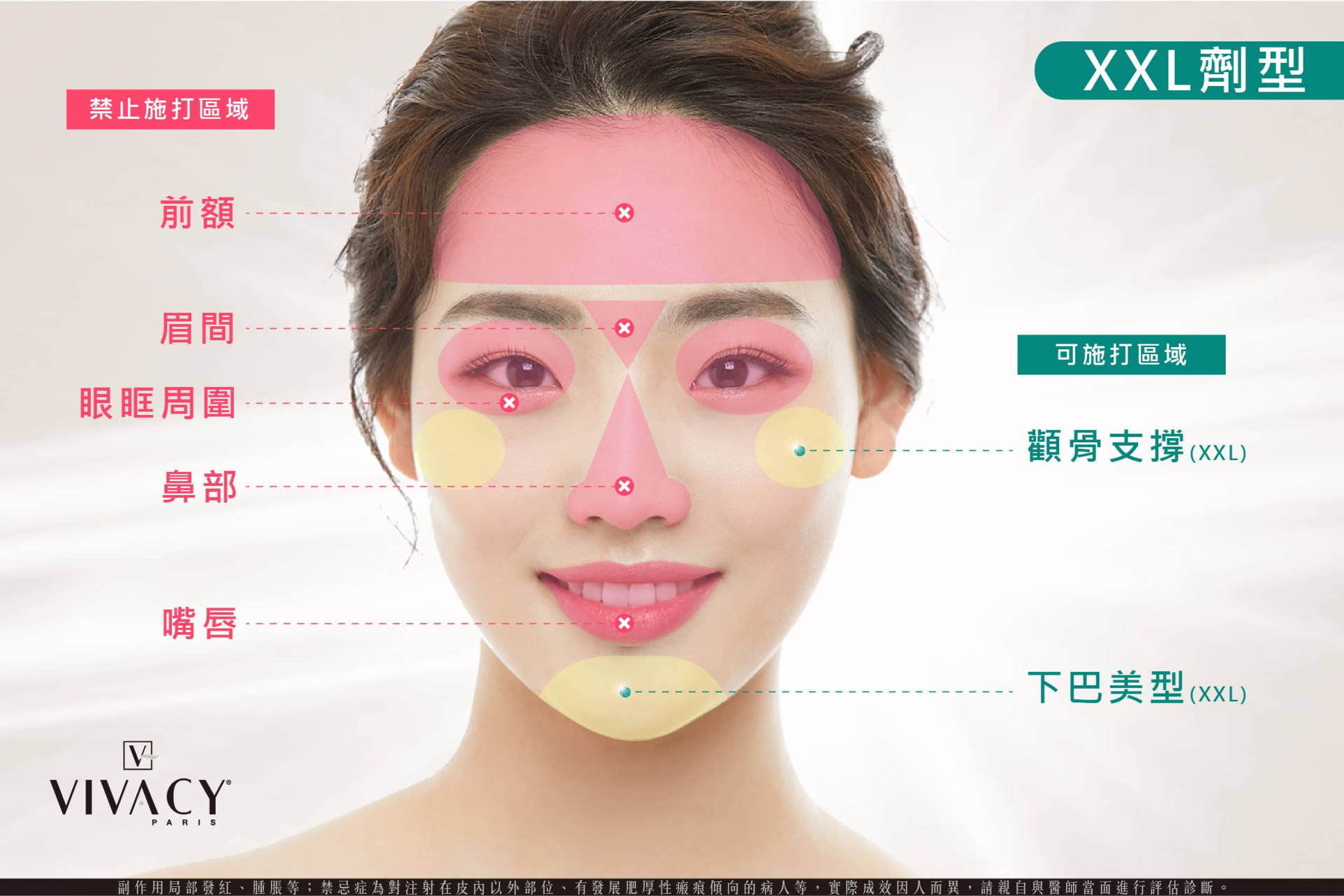 - VIVACY – XXL劑型:Vivacy 維法熙玻尿酸 XXL 劑型擁有更好的支撐性,屬於大分子玻尿酸。非常適合用於臉部輪廓雕塑、深層皺紋填充,如:下巴塑型、顴骨支撐等,打造出自然柔順的立體線條。