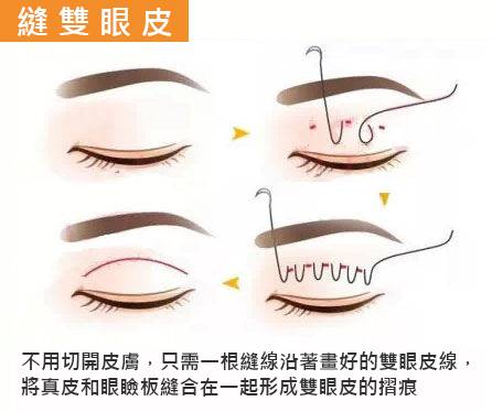 手術是將眼皮縫到提眼肌的肌膜或是眼瞼板(皮下埋線),以縫線刺激疤痕產生,製造眼皮和提眼肌間的黏連,一般是在眼皮前、中、後平均以三個小的縫針孔,將很細的縫線帶入,來創造眼皮與筋膜的沾粘,以形成雙眼皮摺痕。